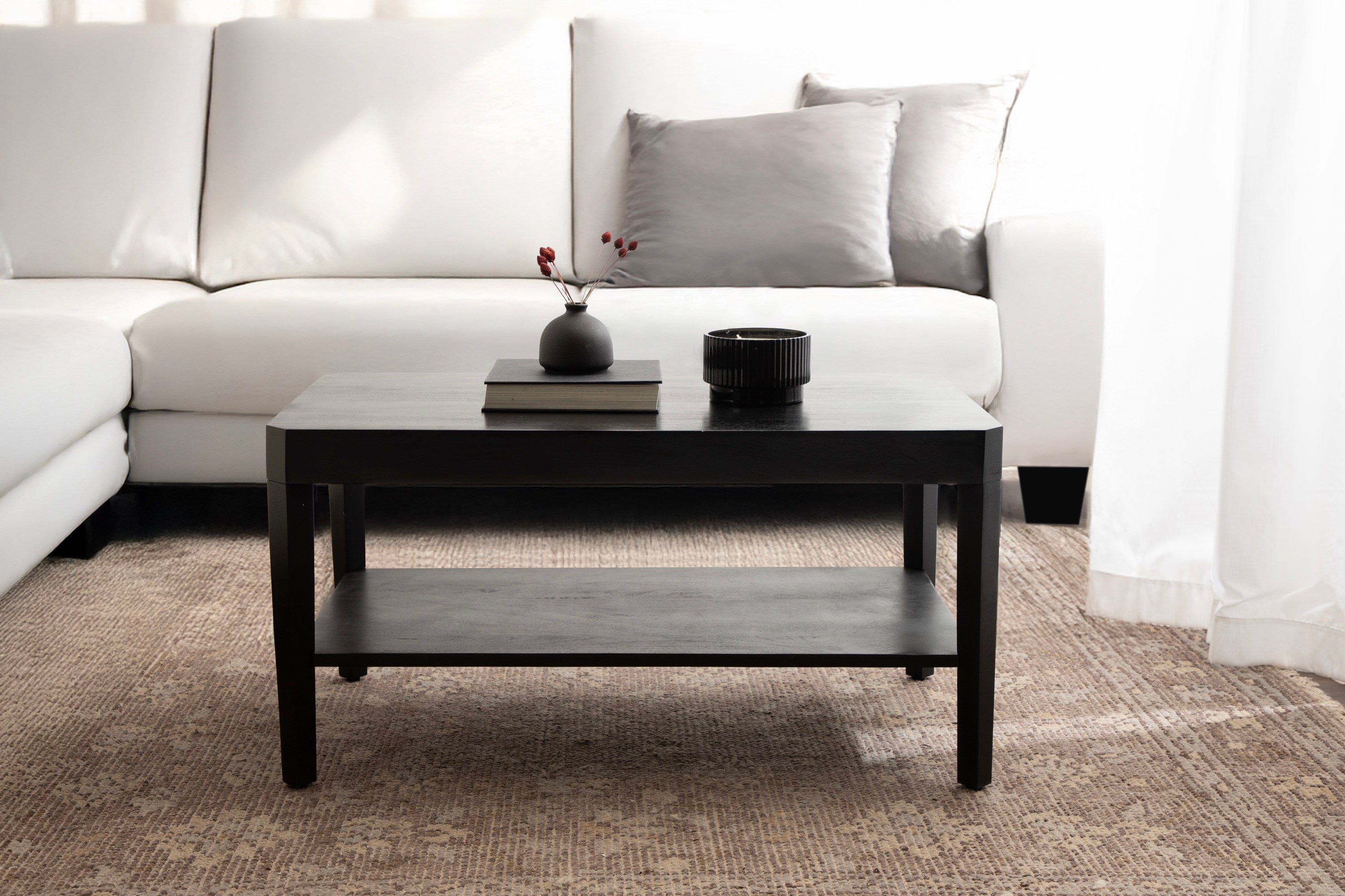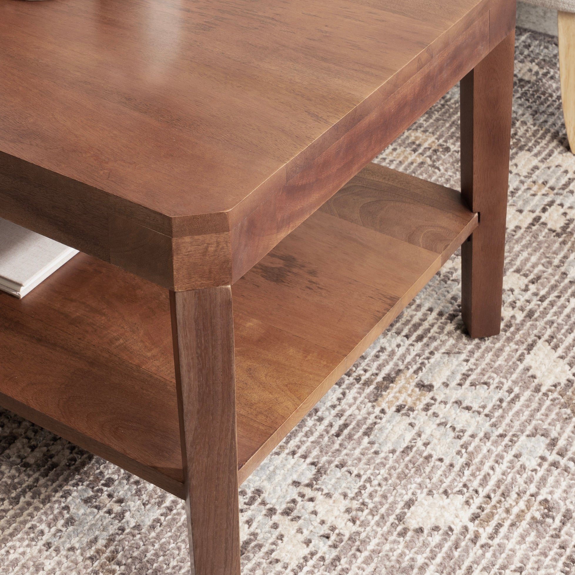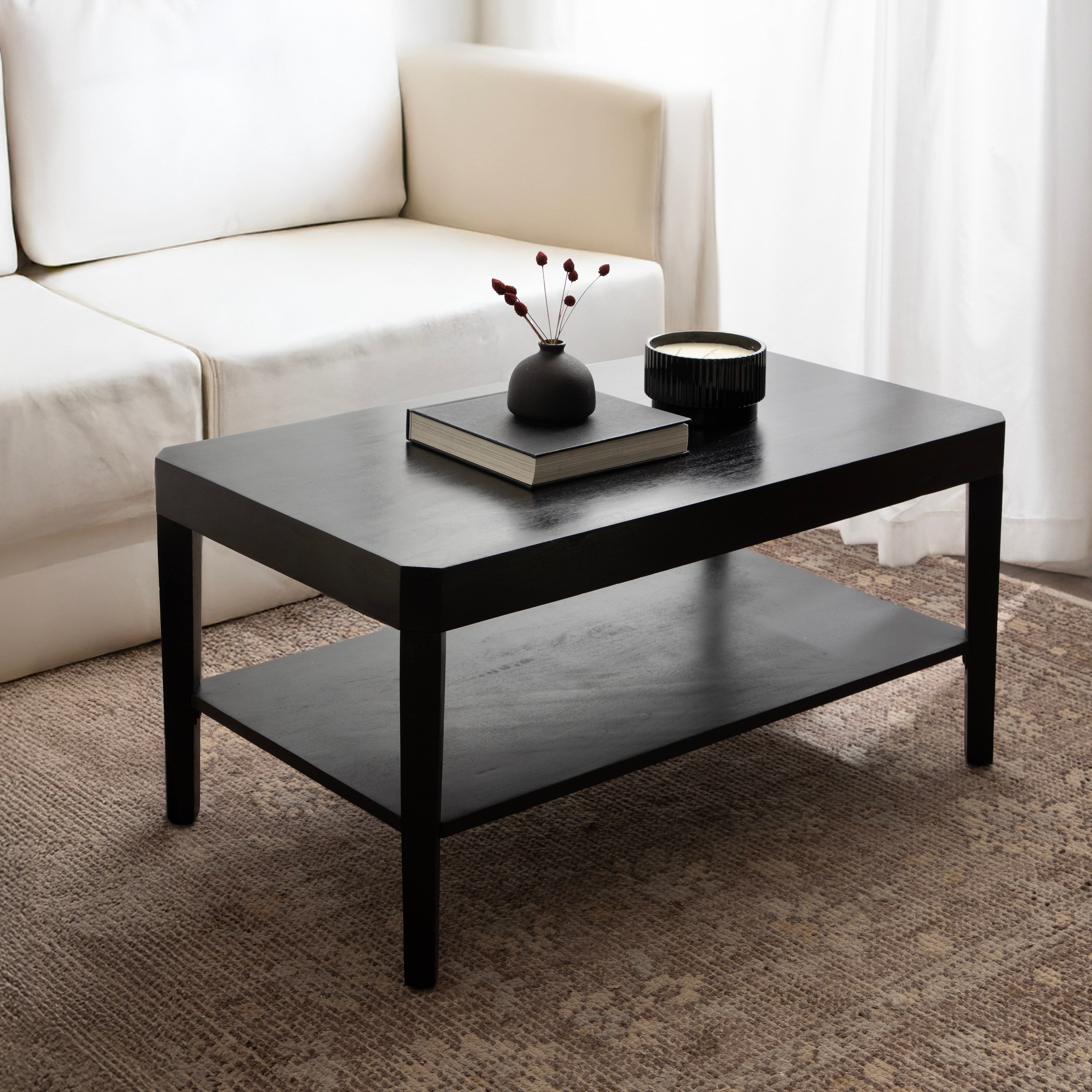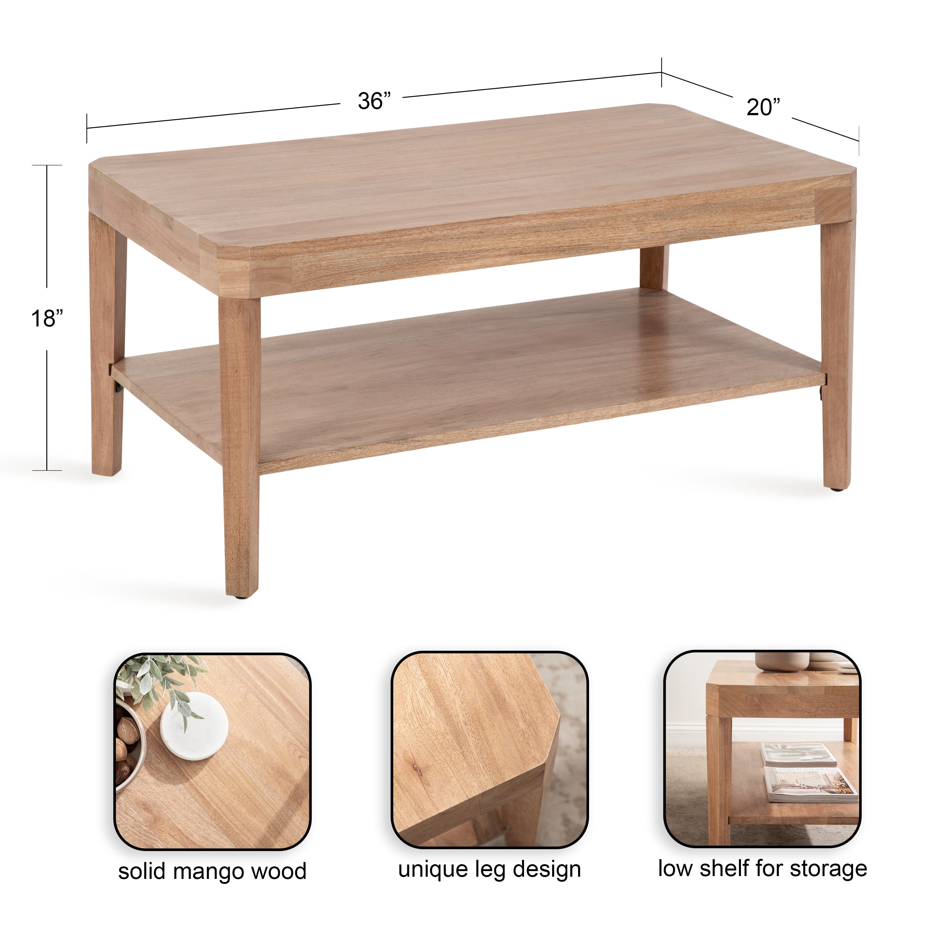 Showcase your transitional-inspired style with this stunning rectangle coffee table. The rich and elegant finish of the wood adds a touch of sophistication to any space, while the simple and clean lines of the design make it easy to blend seamlessly with any decor style. Gorgeous mango wood was used to craft this beautiful coffee table, creating a statement that is as durable as it is beautiful. The top wooden tier is perfect for creating a lovely display area for candles, small lamps, and other accents. The bottom tier of the table is great for storing your favorite household accessories, from blankets and pillows to everyday essentials.
