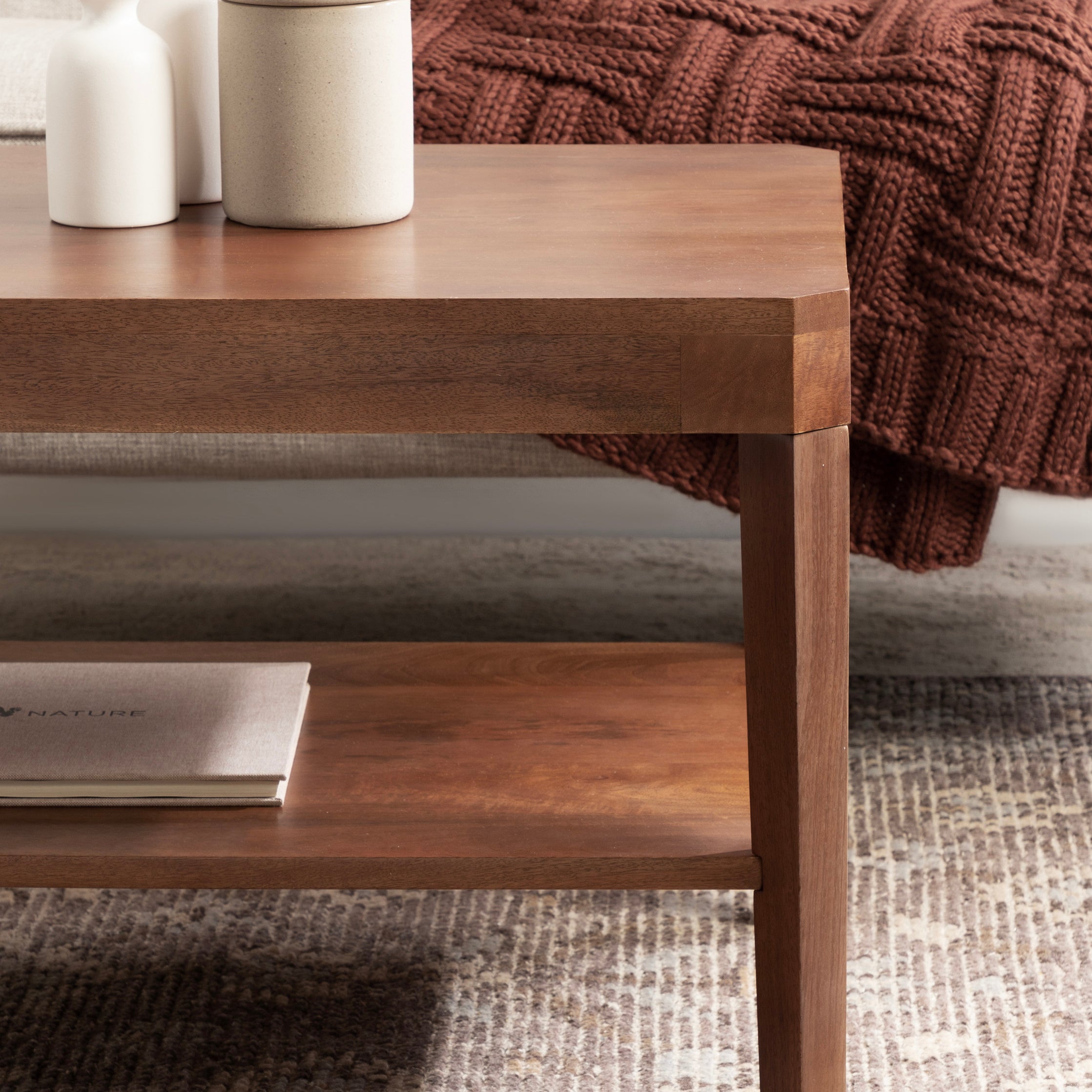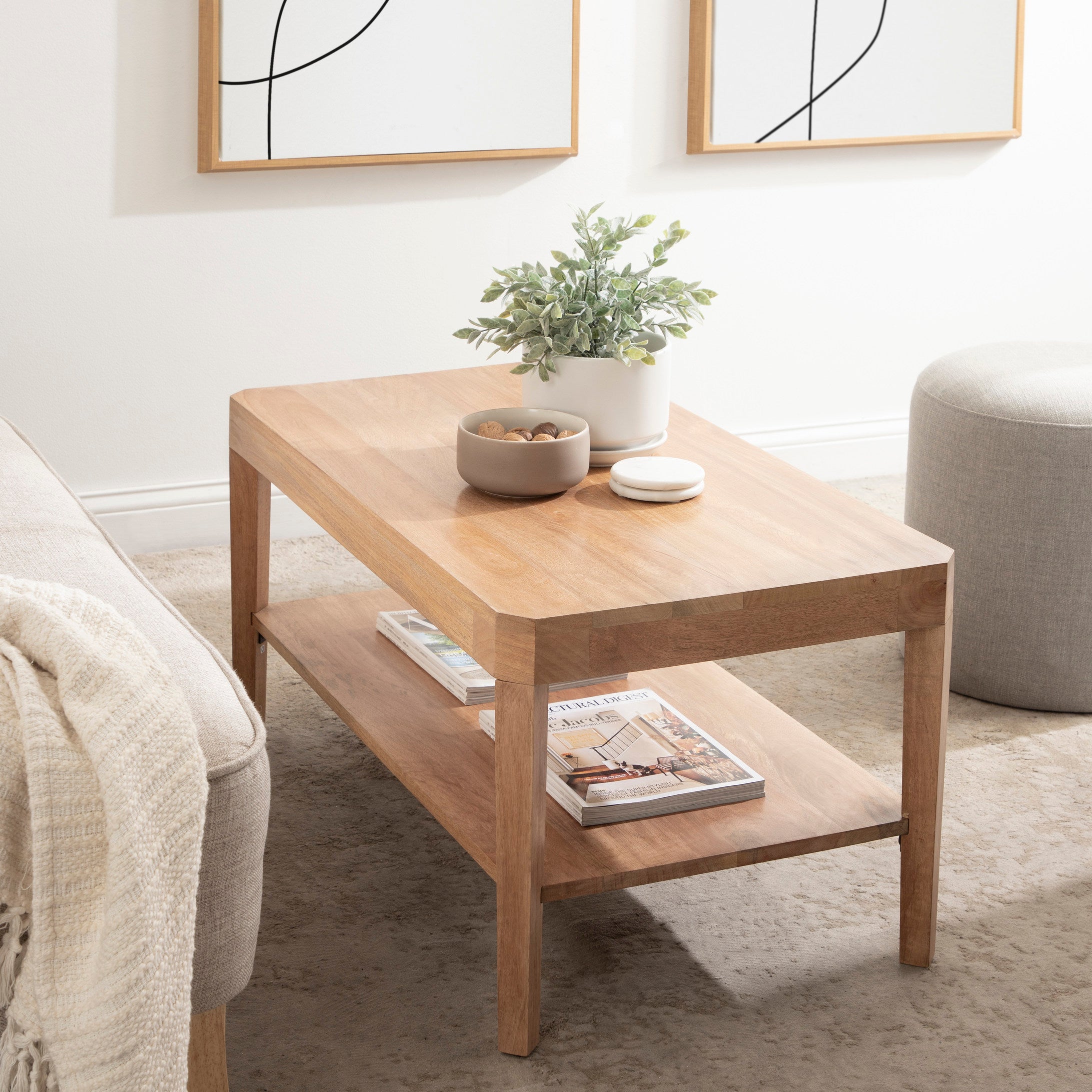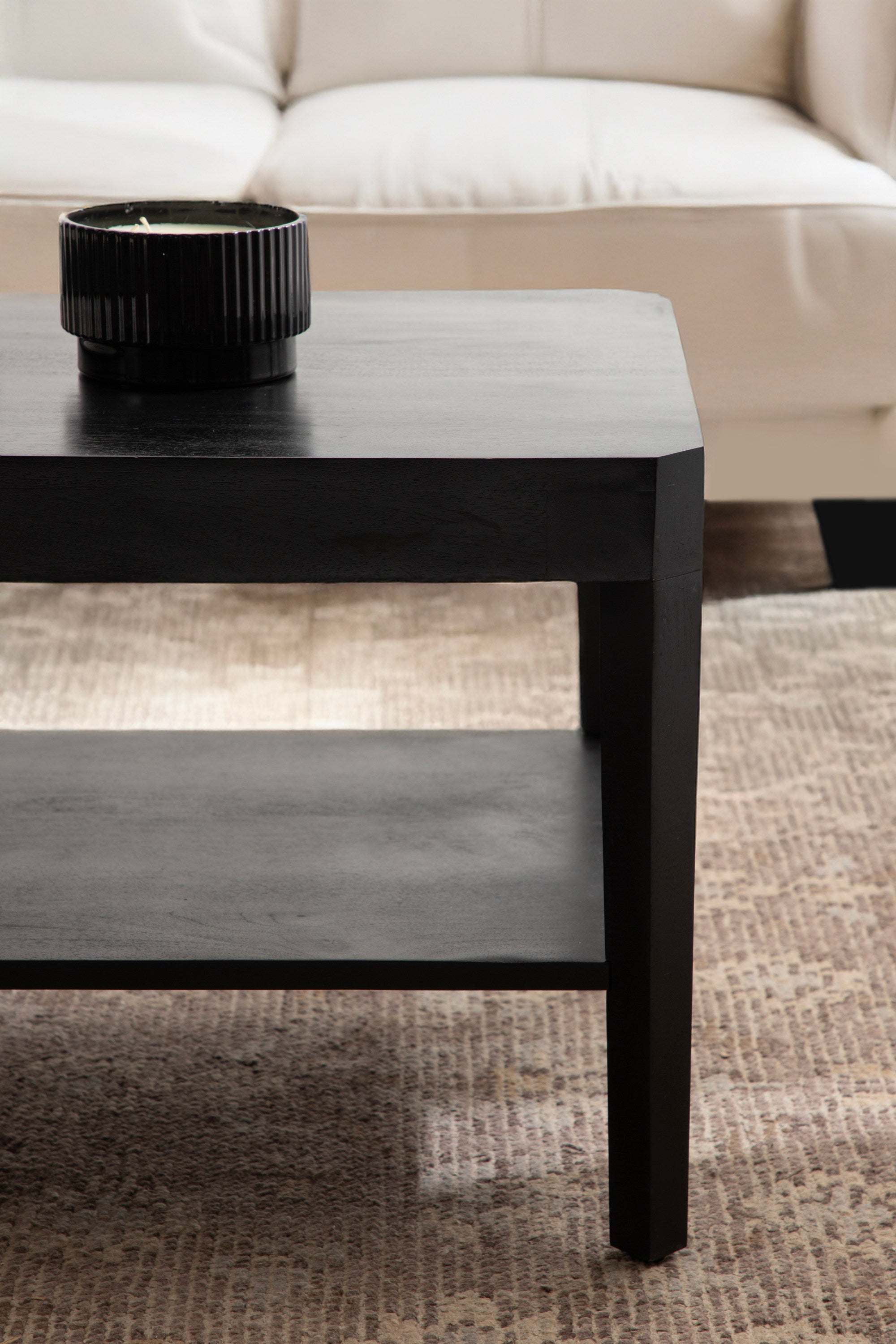 Showcase your transitional-inspired style with this stunning rectangle coffee table. The rich and elegant finish of the wood adds a touch of sophistication to any space, while the simple and clean lines of the design make it easy to blend seamlessly with any decor style. Gorgeous mango wood was used to craft this beautiful coffee table, creating a statement that is as durable as it is beautiful. The top wooden tier is perfect for creating a lovely display area for candles, small lamps, and other accents. The bottom tier of the table is great for storing your favorite household accessories, from blankets and pillows to everyday essentials.