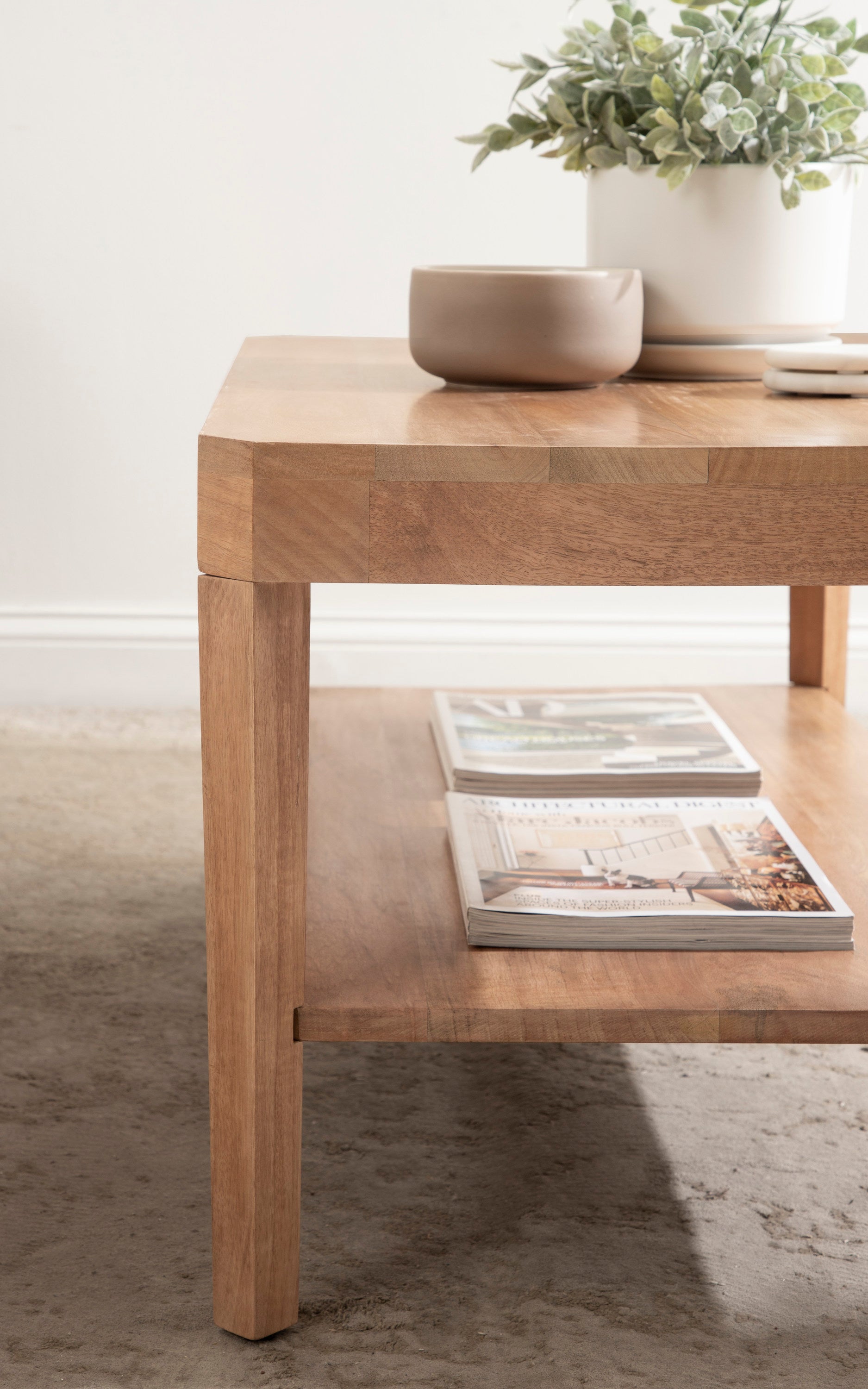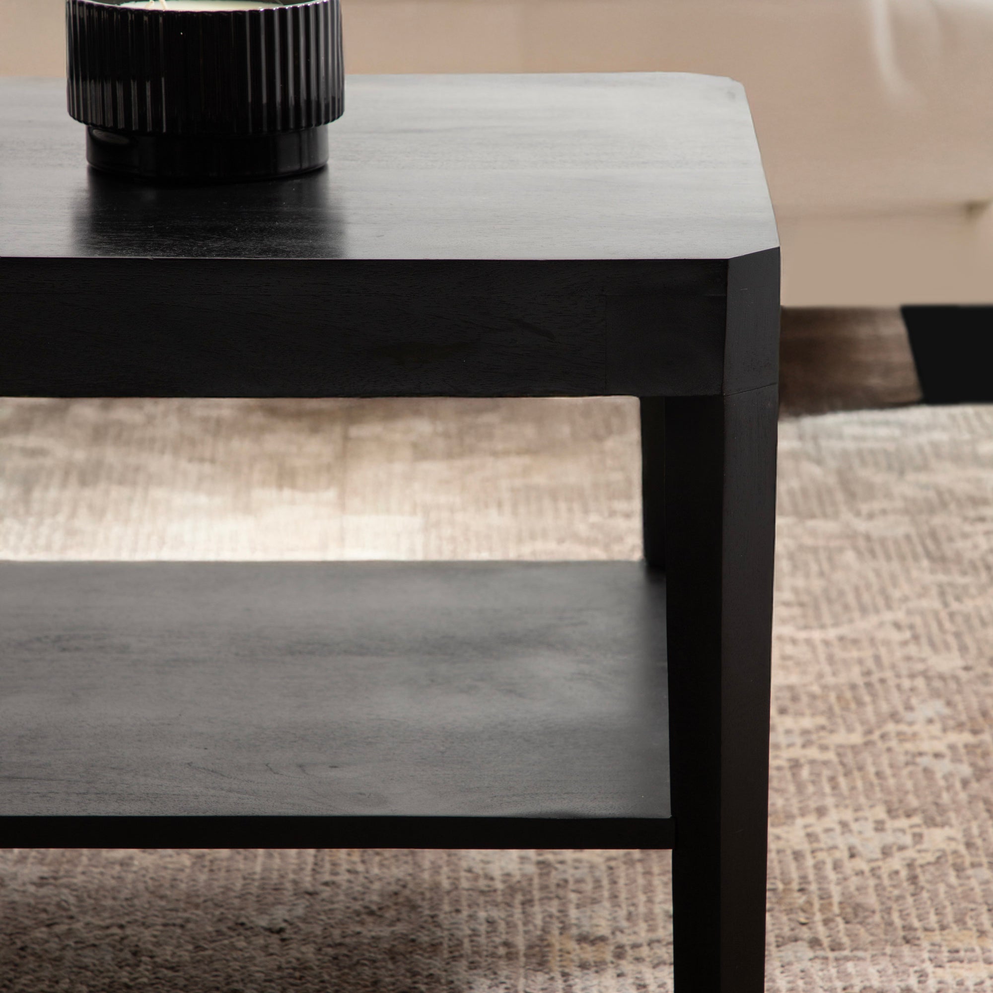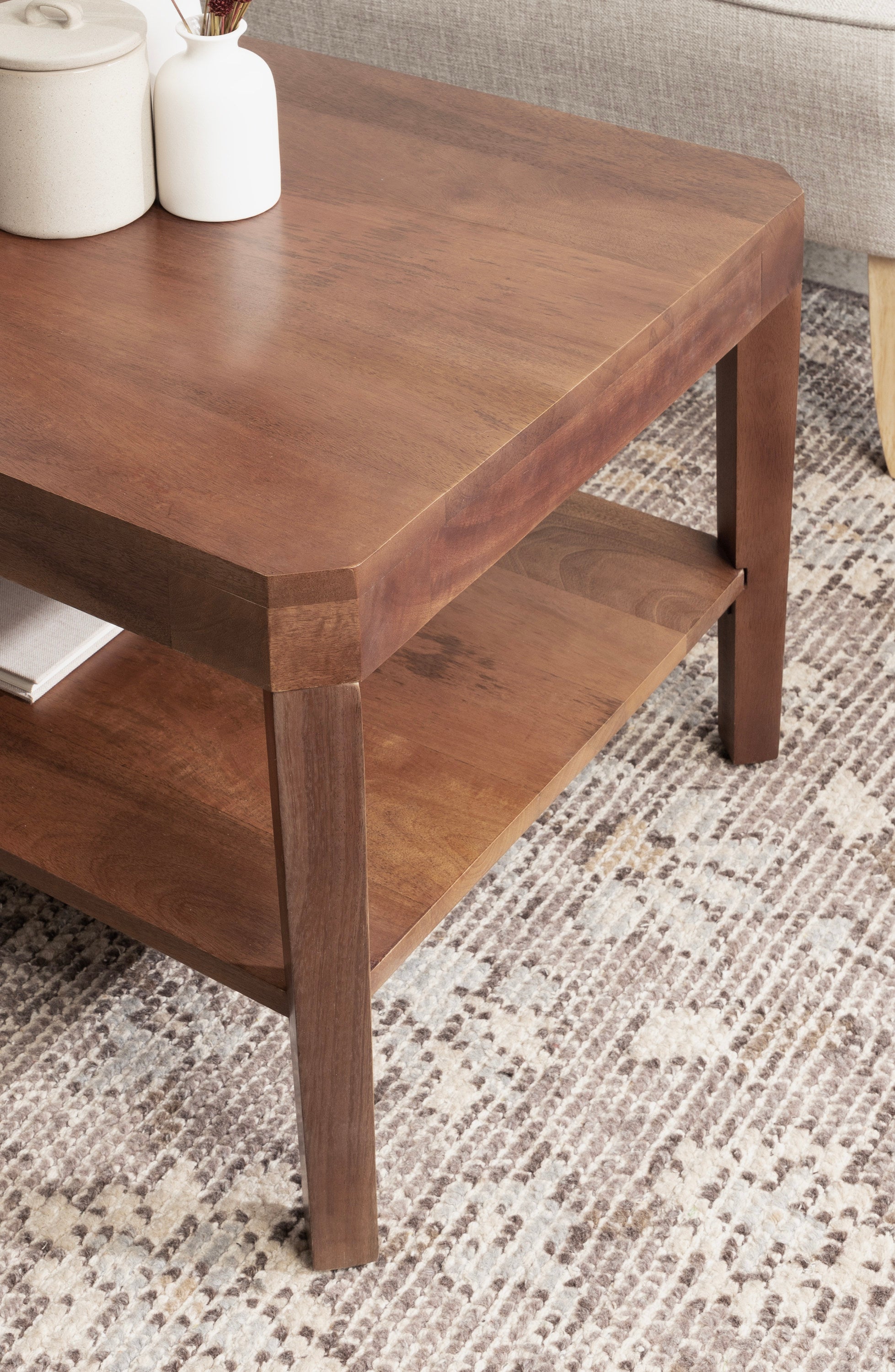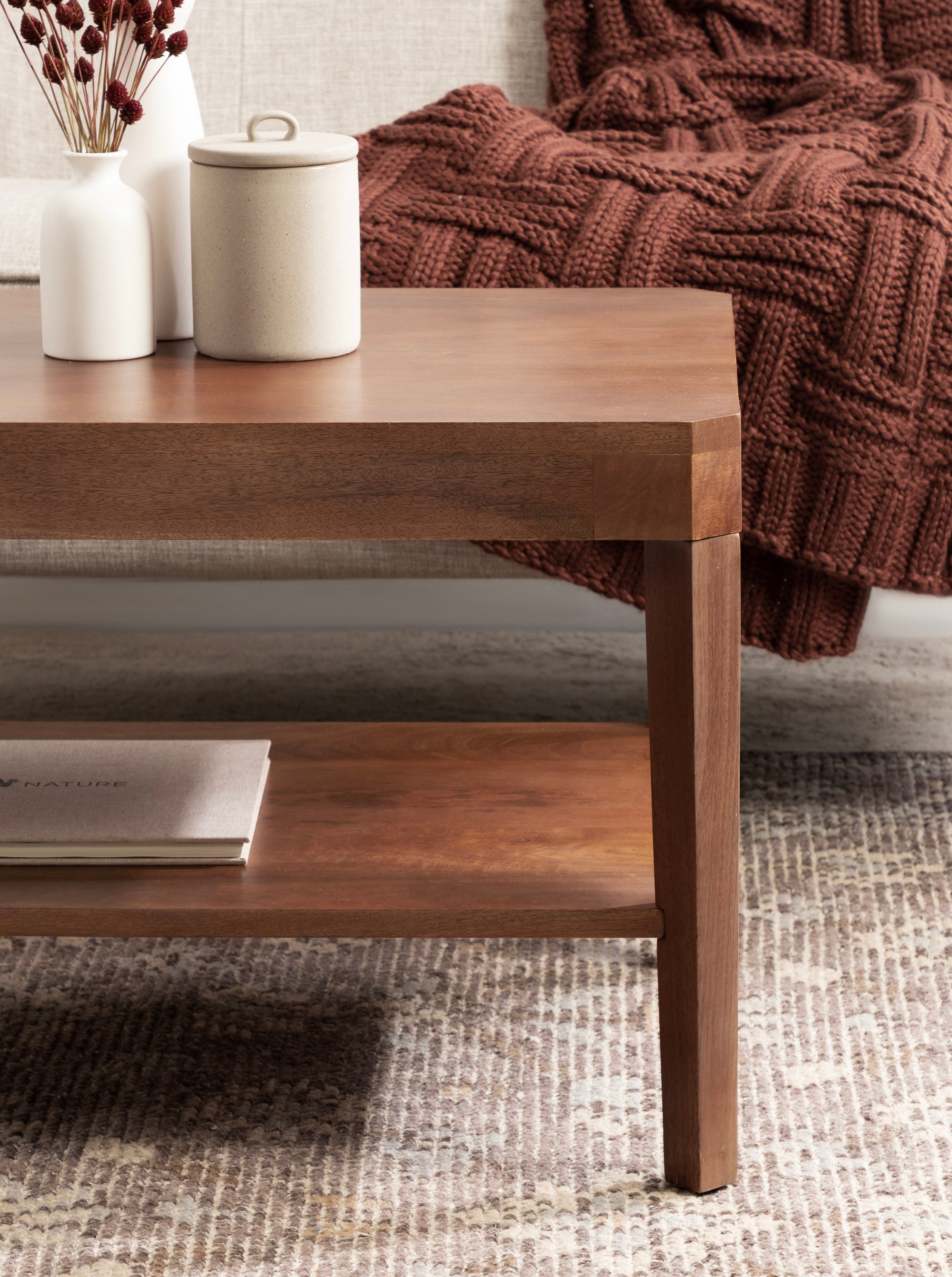 Showcase your transitional-inspired style with this stunning rectangle coffee table. The rich and elegant finish of the wood adds a touch of sophistication to any space, while the simple and clean lines of the design make it easy to blend seamlessly with any decor style. Gorgeous mango wood was used to craft this beautiful coffee table, creating a statement that is as durable as it is beautiful. The top wooden tier is perfect for creating a lovely display area for candles, small lamps, and other accents. The bottom tier of the table is great for storing your favorite household accessories, from blankets and pillows to everyday essentials.
