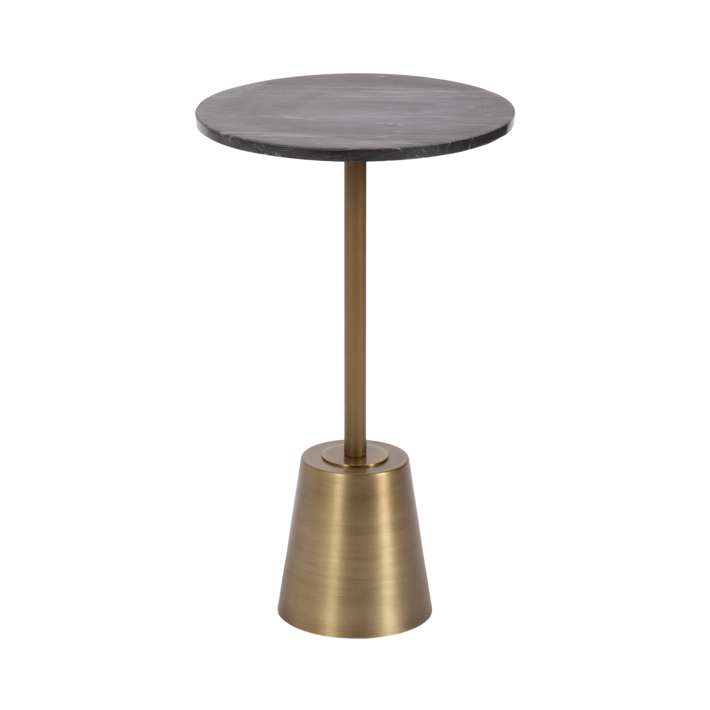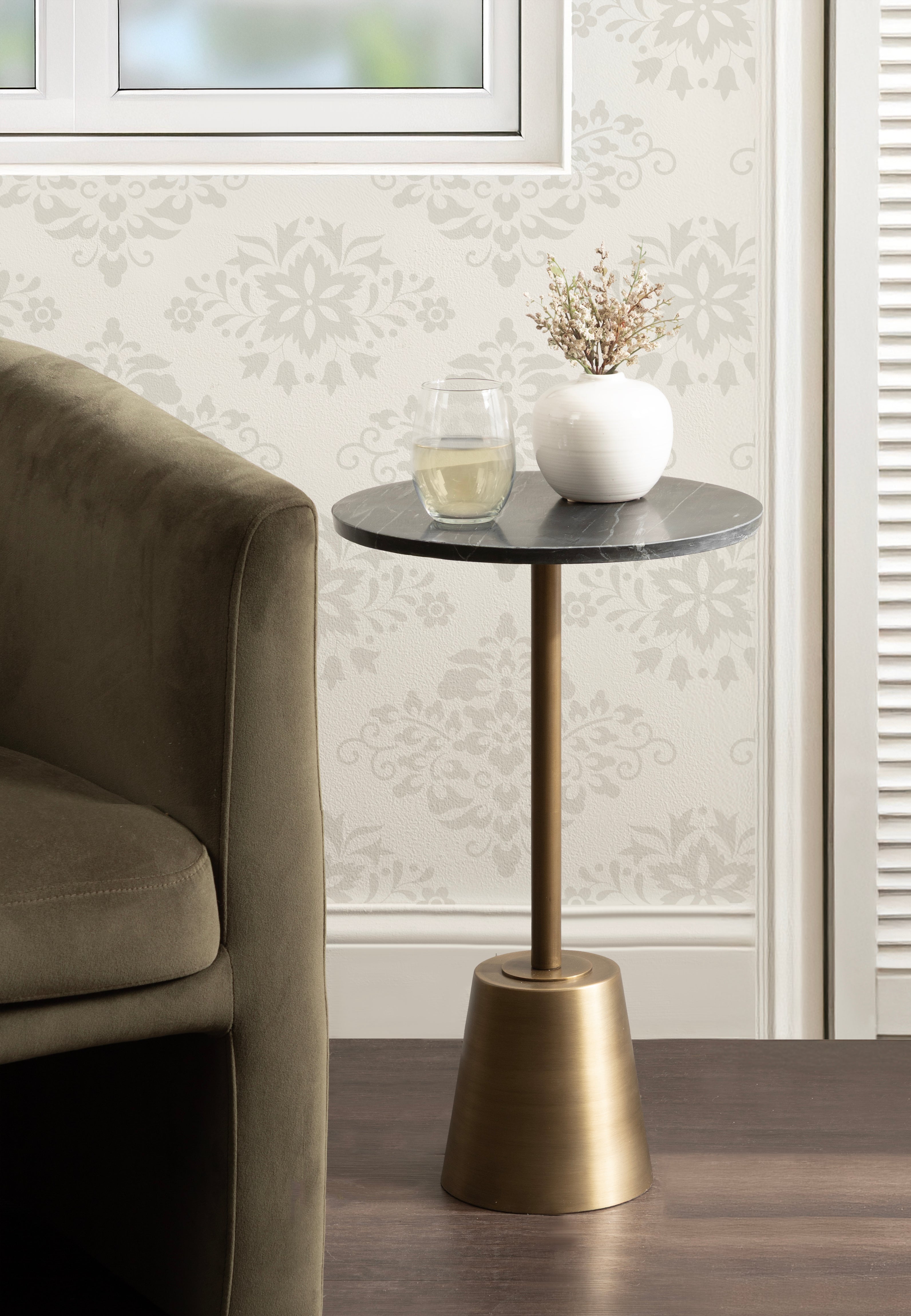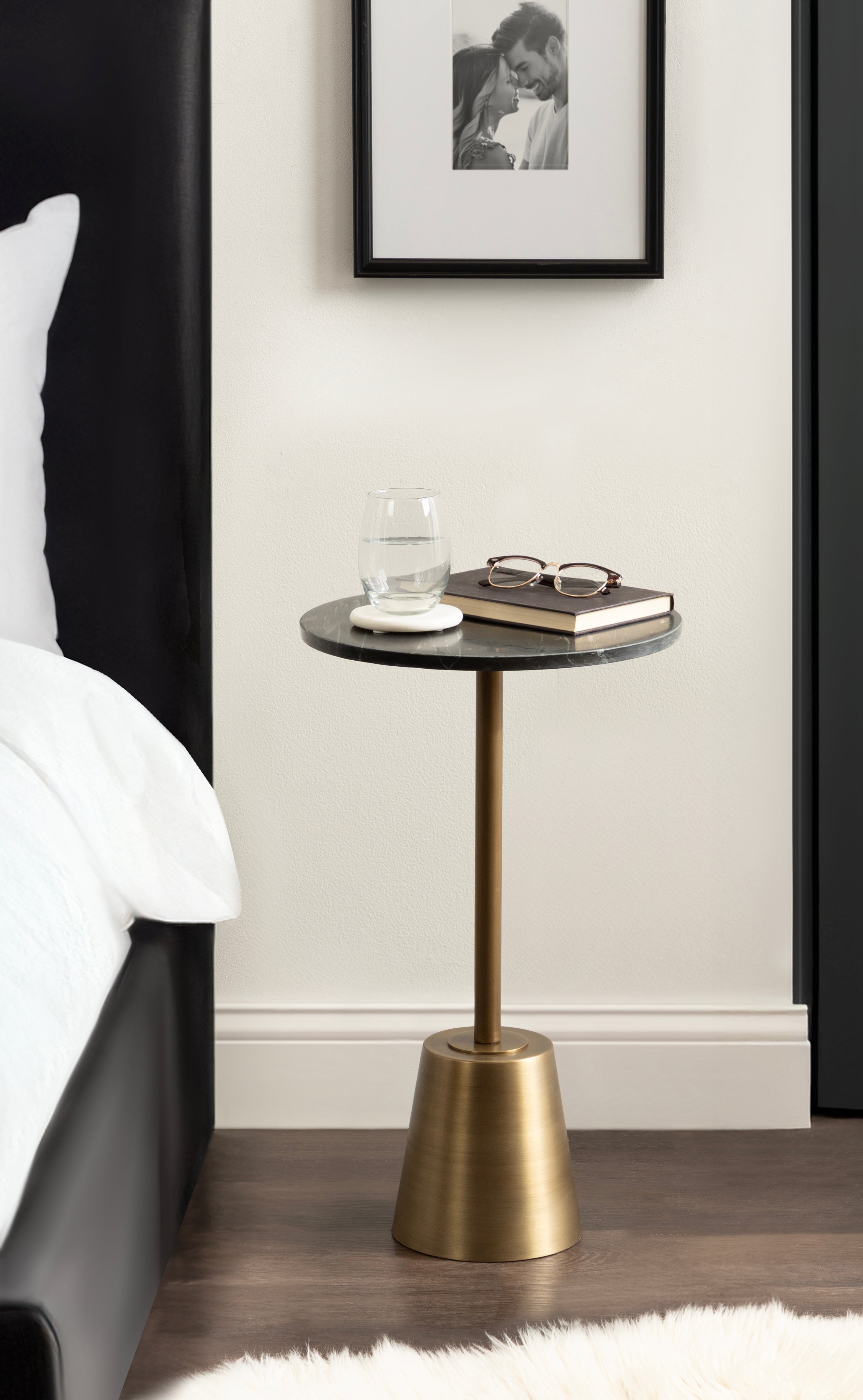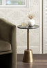 This drink table features a striking combination of finishes which create a luxurious aesthetic that is sure to impress. This charming cocktail table is a beautiful accent for serving and placing drinks when friends are around due to its sturdy base. Its compact size and round design allow for easy placement and rearrangement to suit your needs. Whether you place it next to your sofa, by your bedside, or in a cozy reading nook, this versatile side table effortlessly enhances any space.