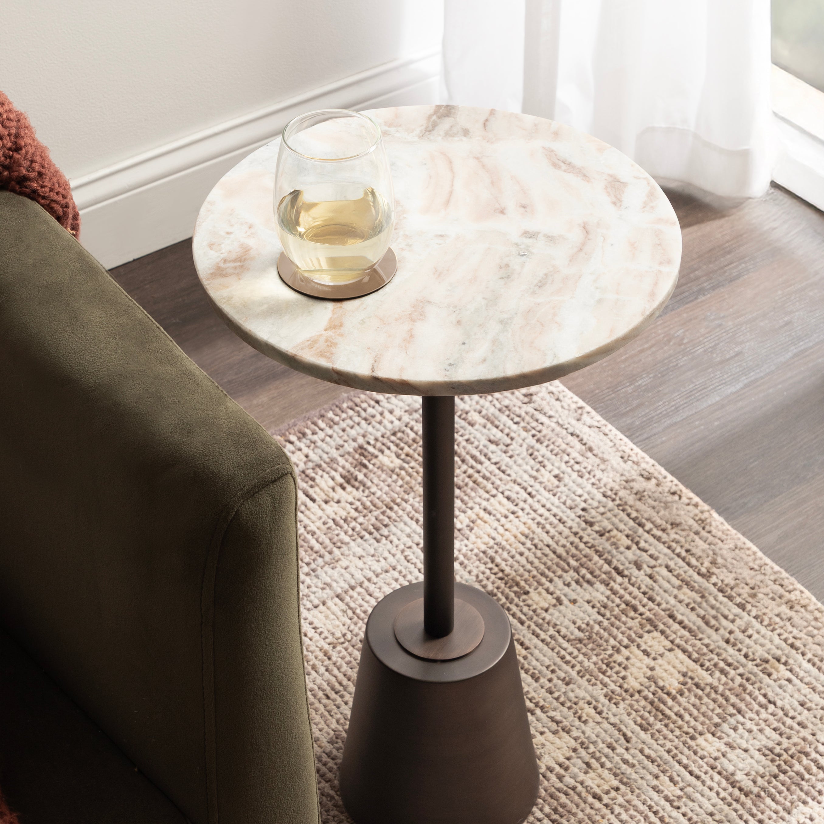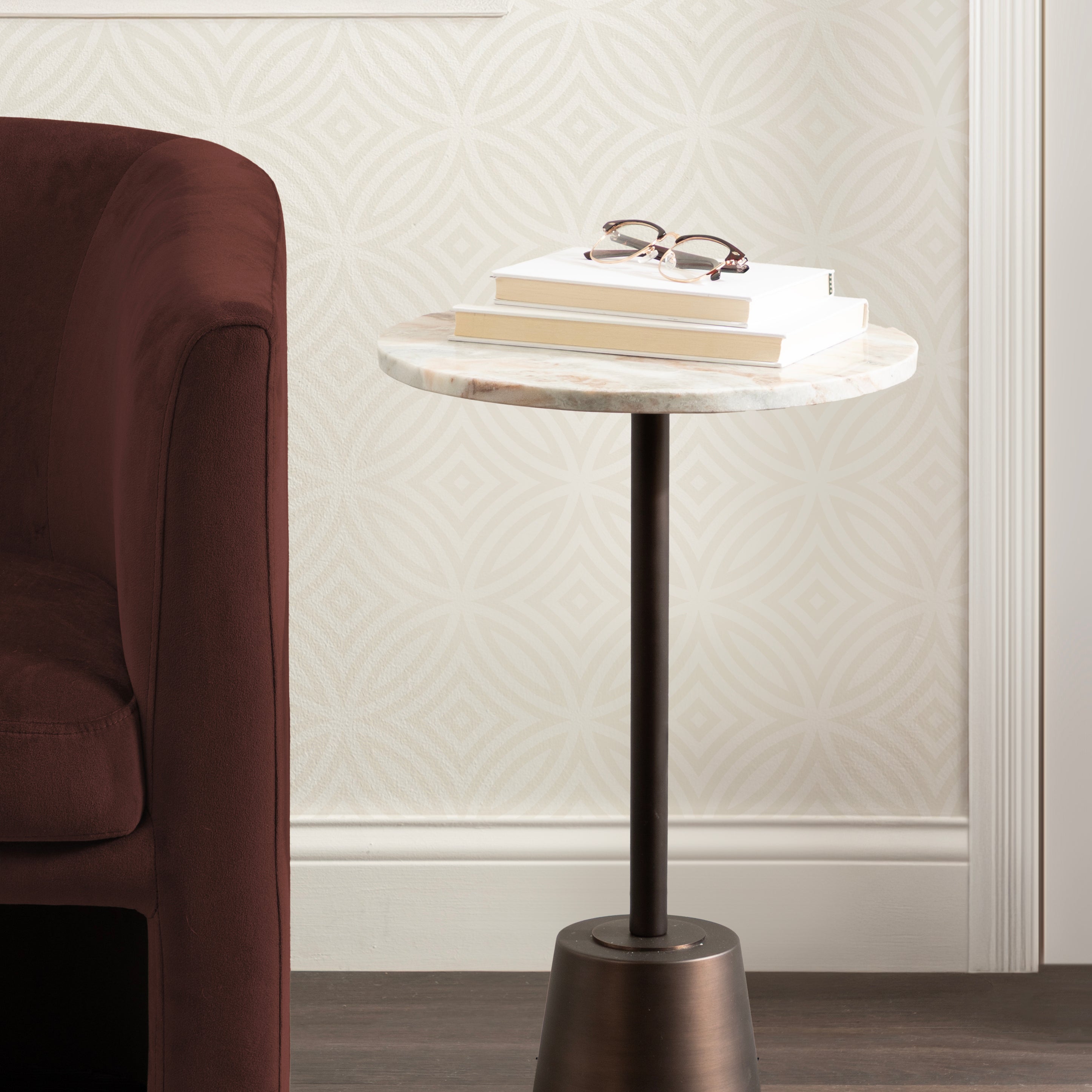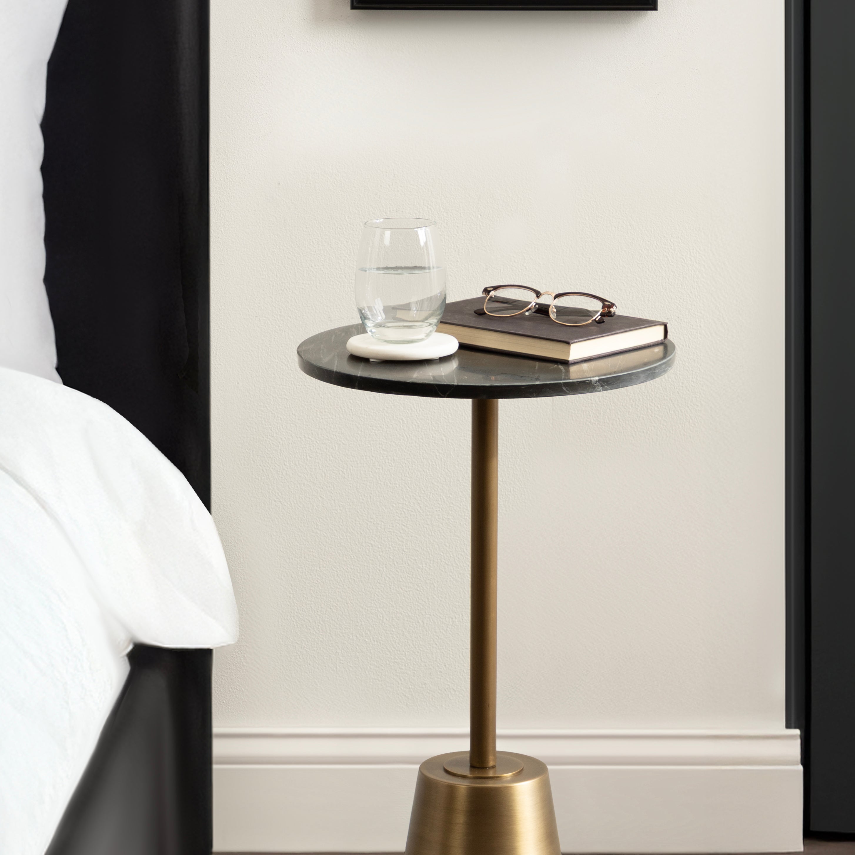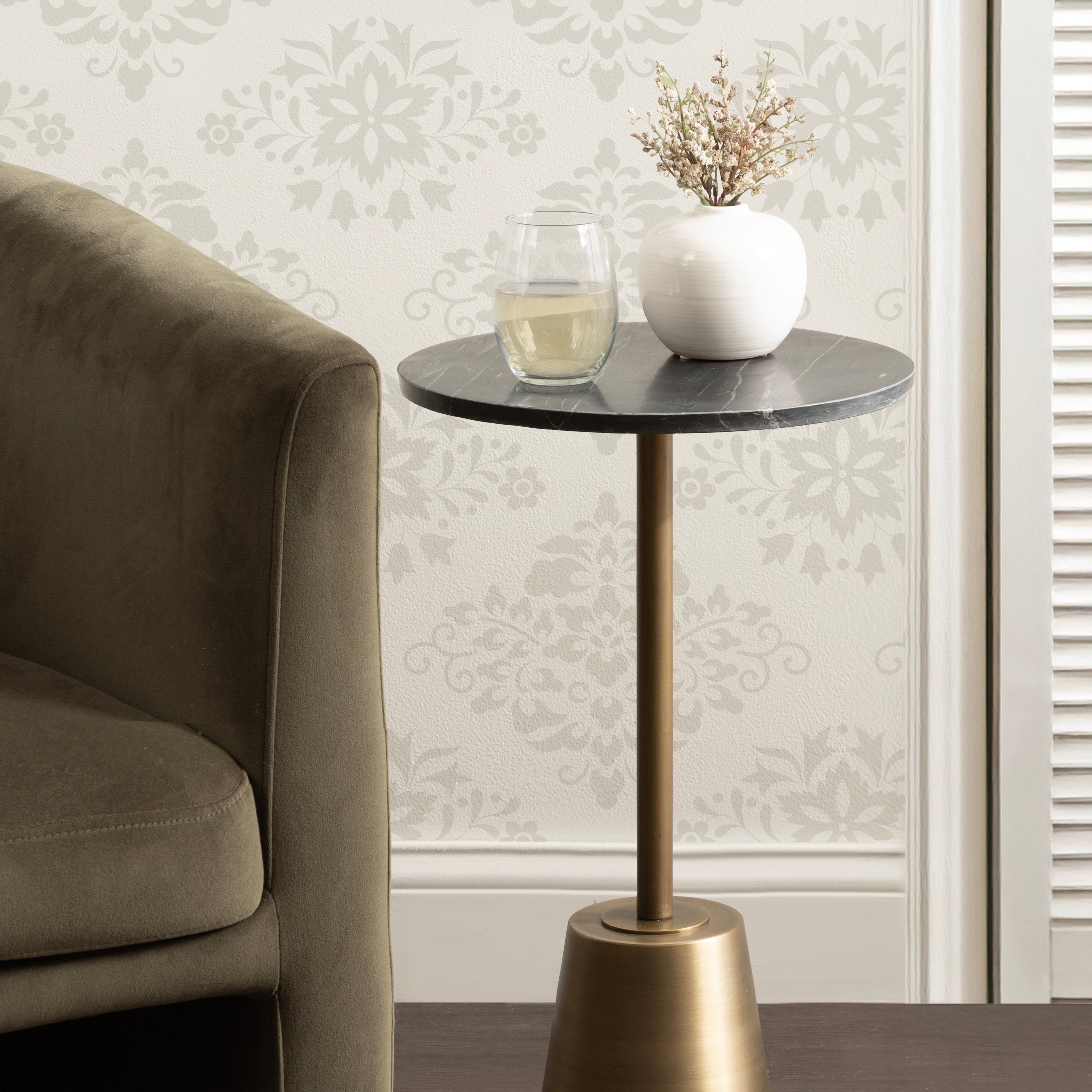 This drink table features a striking combination of finishes which create a luxurious aesthetic that is sure to impress. This charming cocktail table is a beautiful accent for serving and placing drinks when friends are around due to its sturdy base. Its compact size and round design allow for easy placement and rearrangement to suit your needs. Whether you place it next to your sofa, by your bedside, or in a cozy reading nook, this versatile side table effortlessly enhances any space.