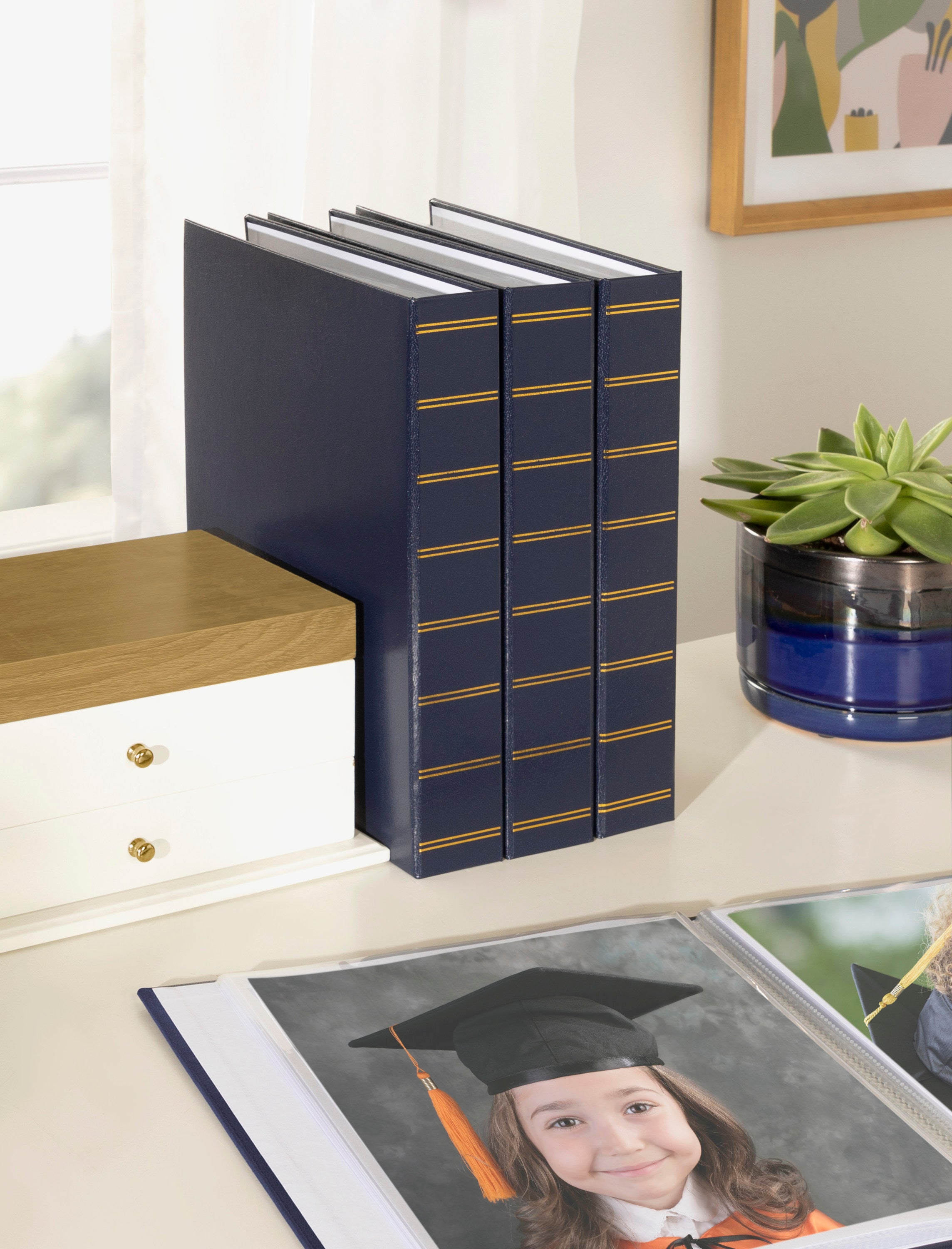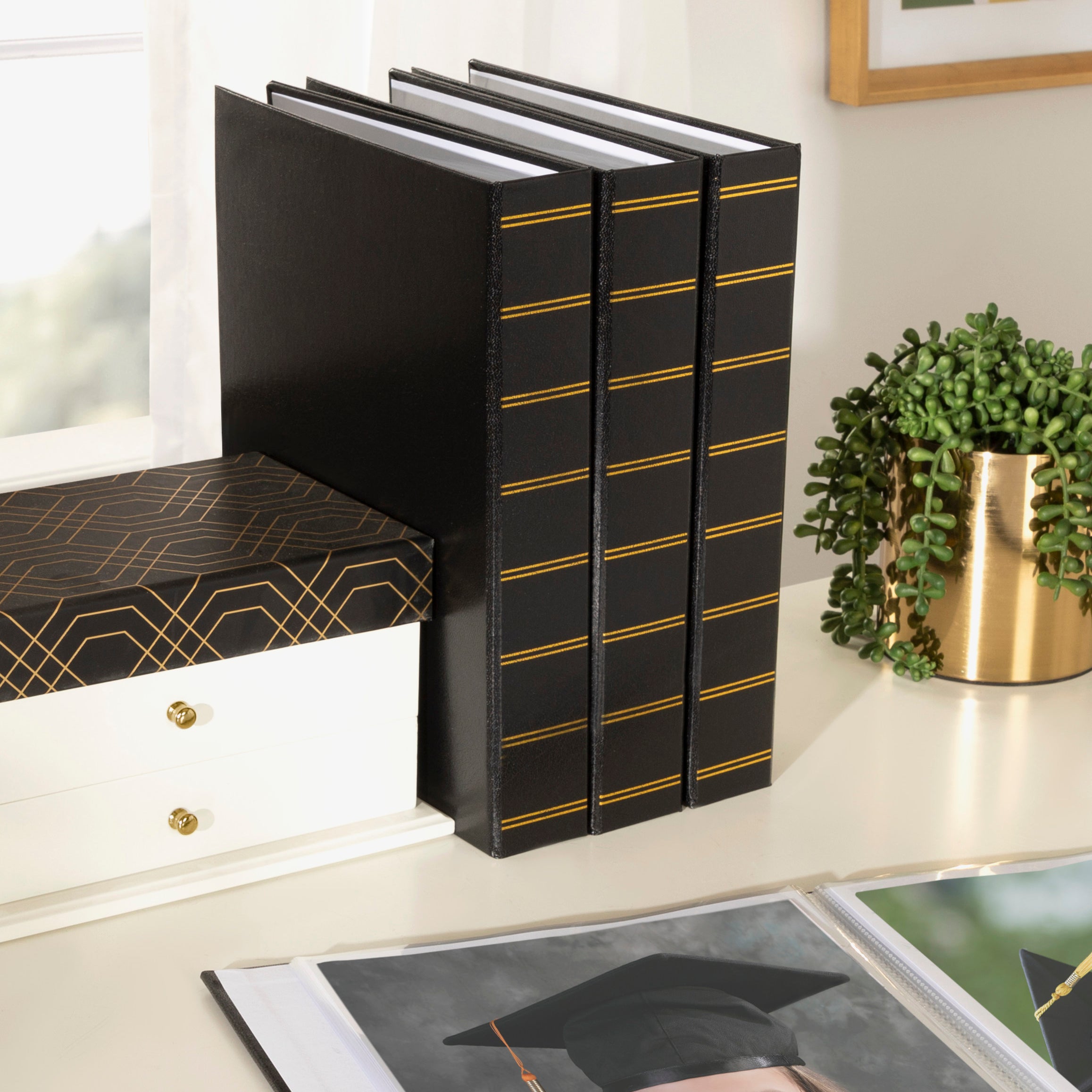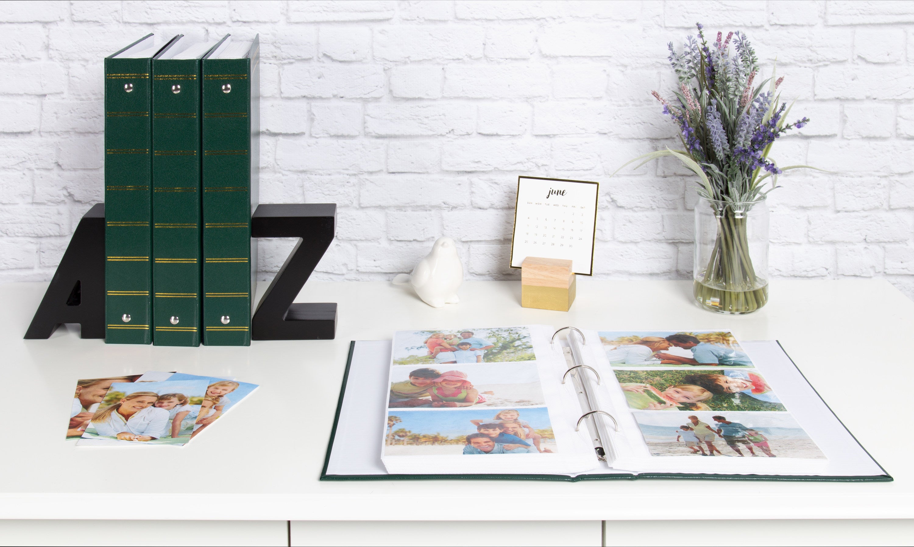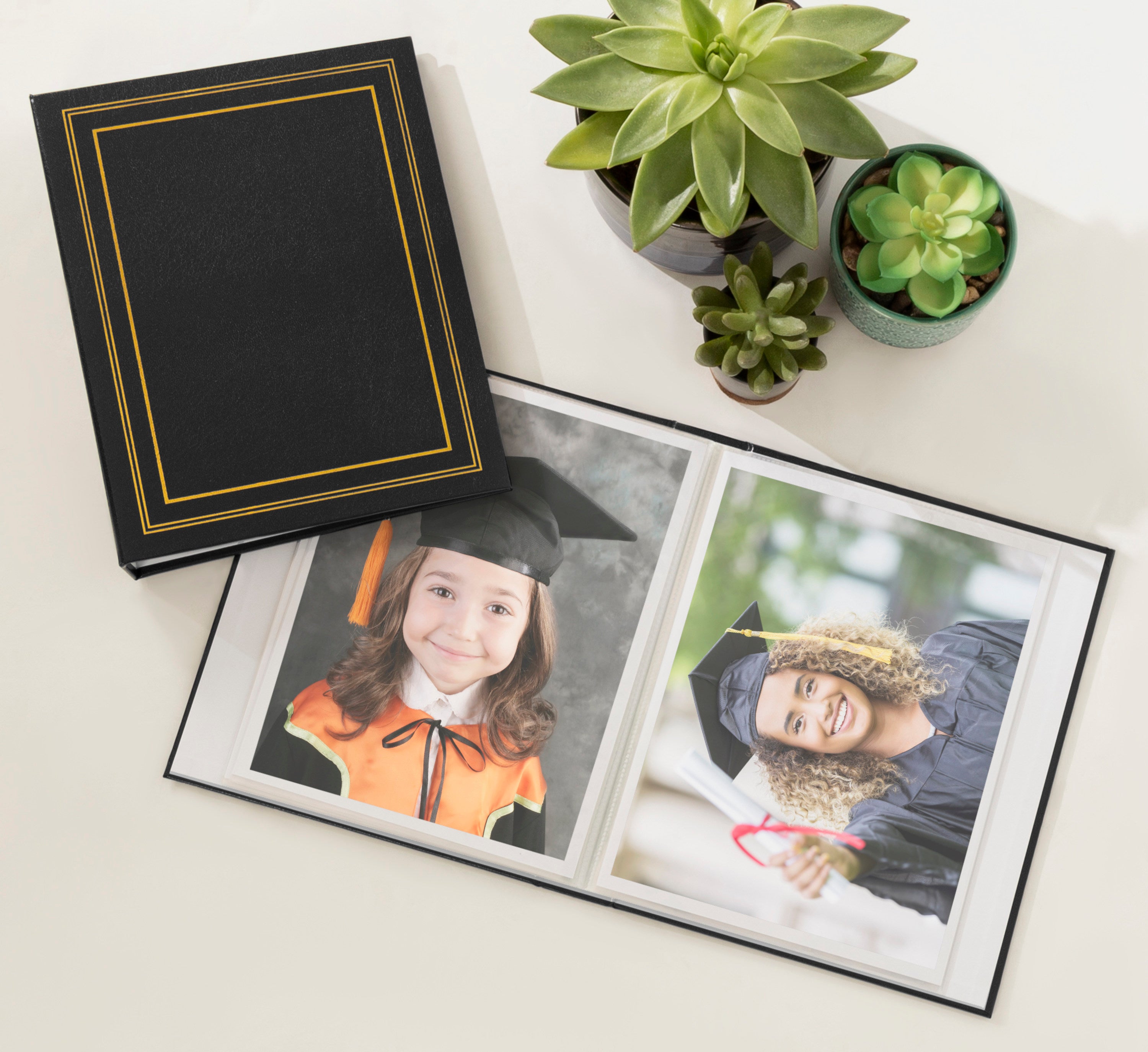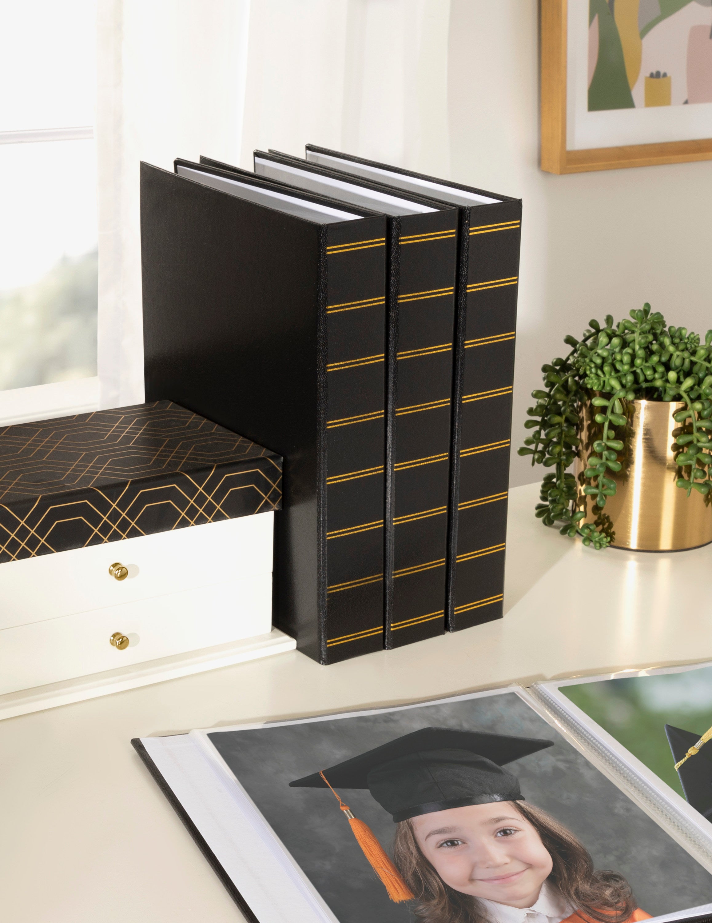 This beautiful collection of photo albums preserves your most cherished memories for generations. This photo album features a sophisticated finish complete with a gold trim that gives it a lovely, classic look. This album can hold 4a6 photos within 20 double-sided pages, bound by a metal 3-ring design that keeps them secure.