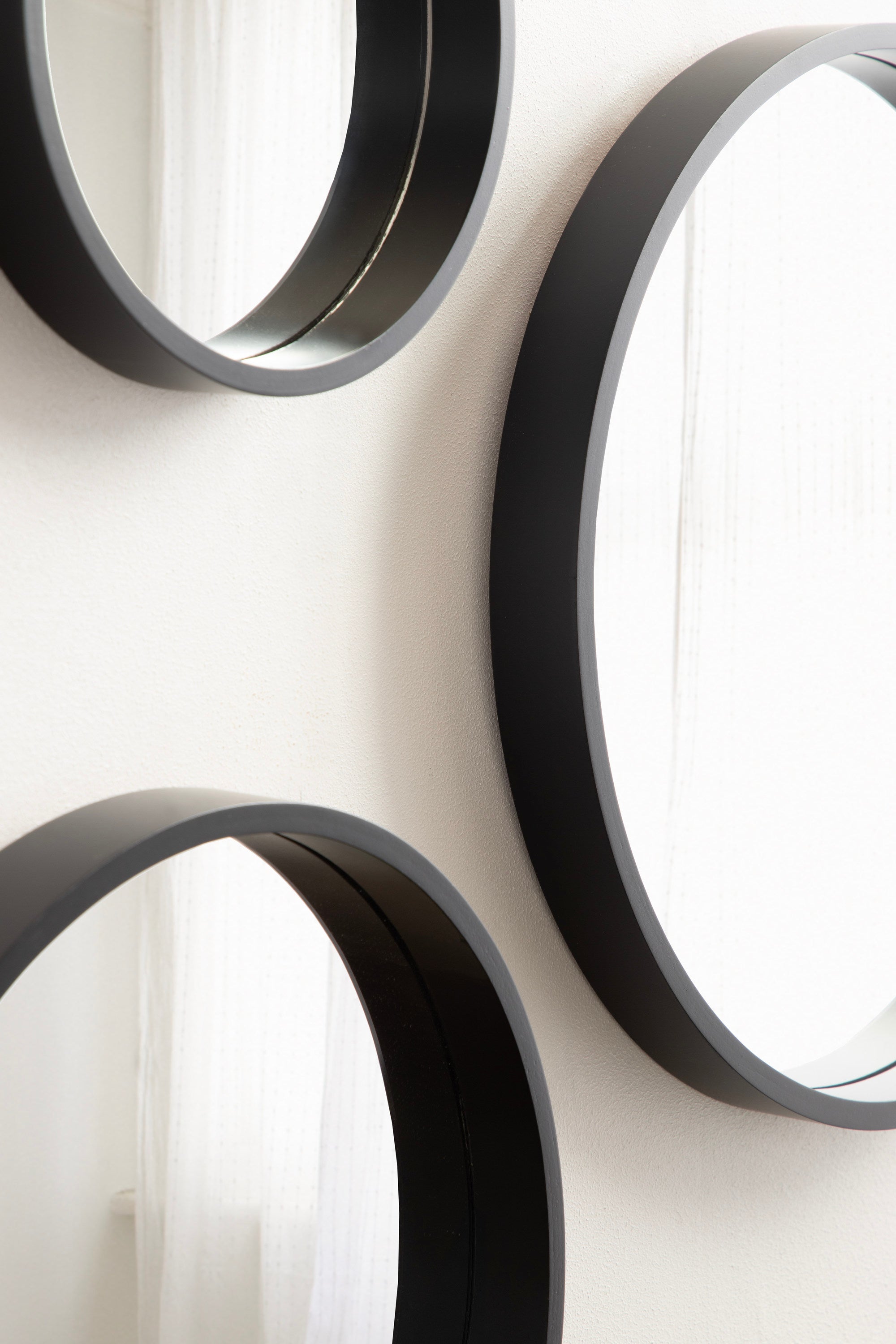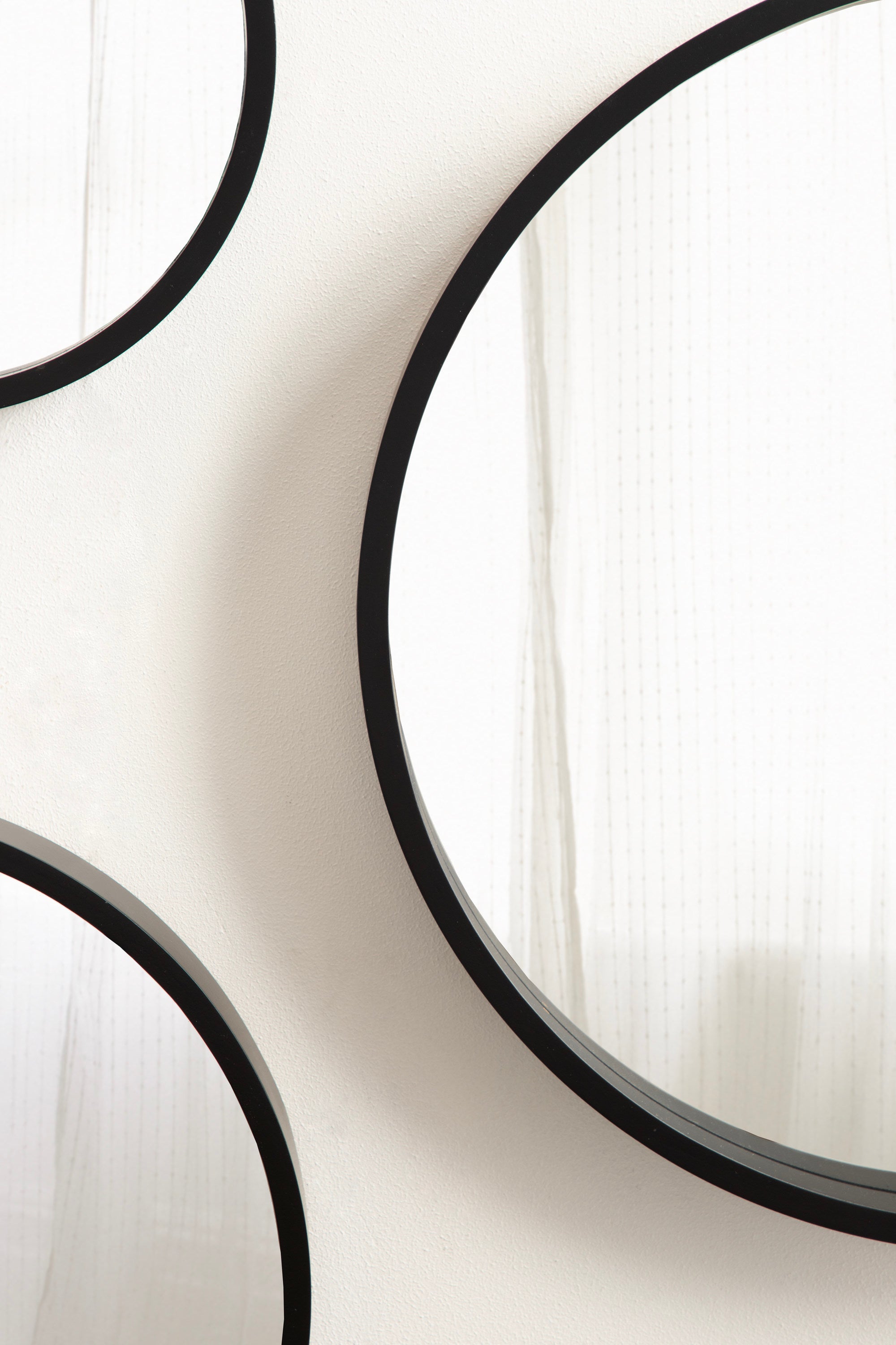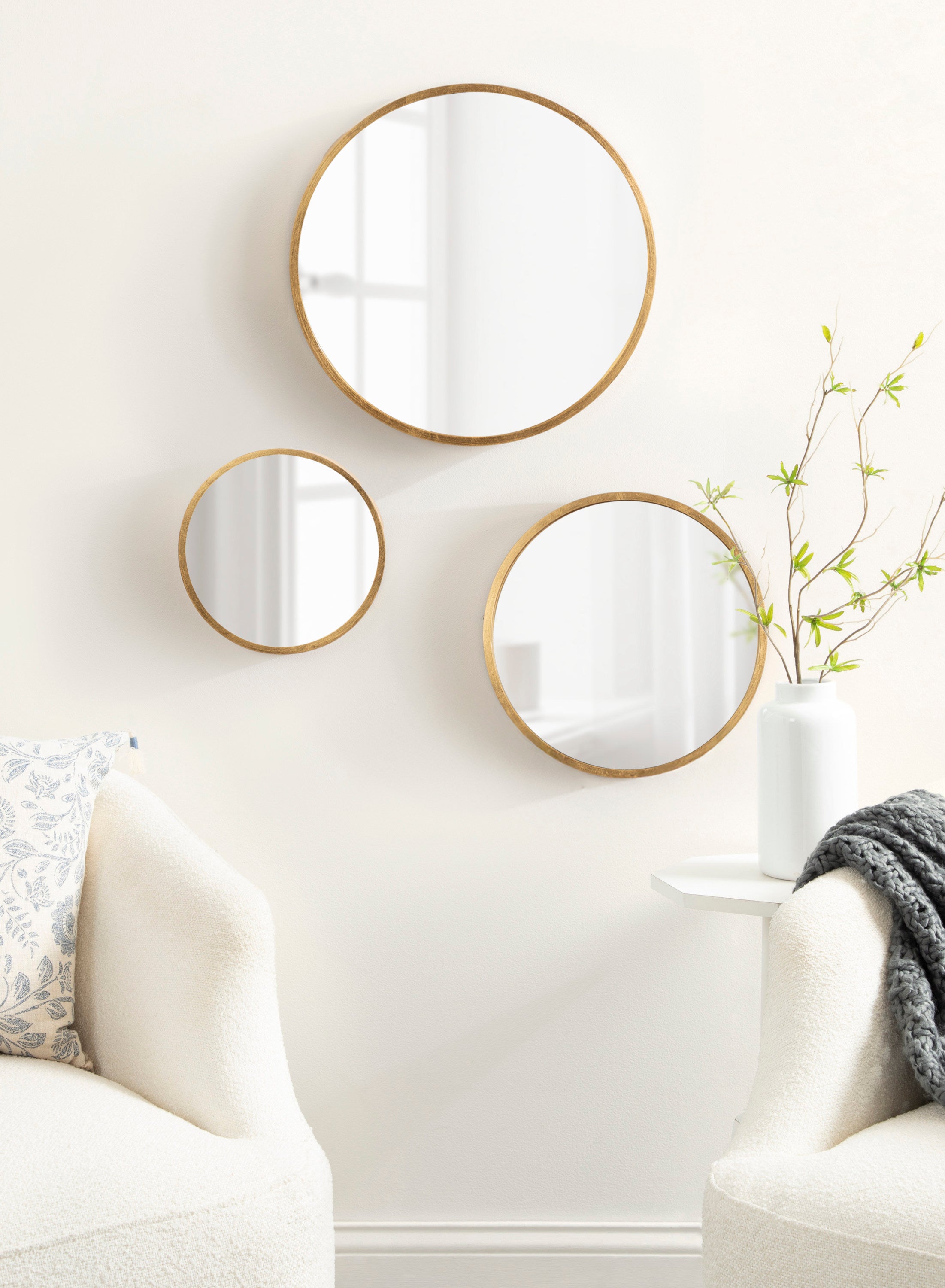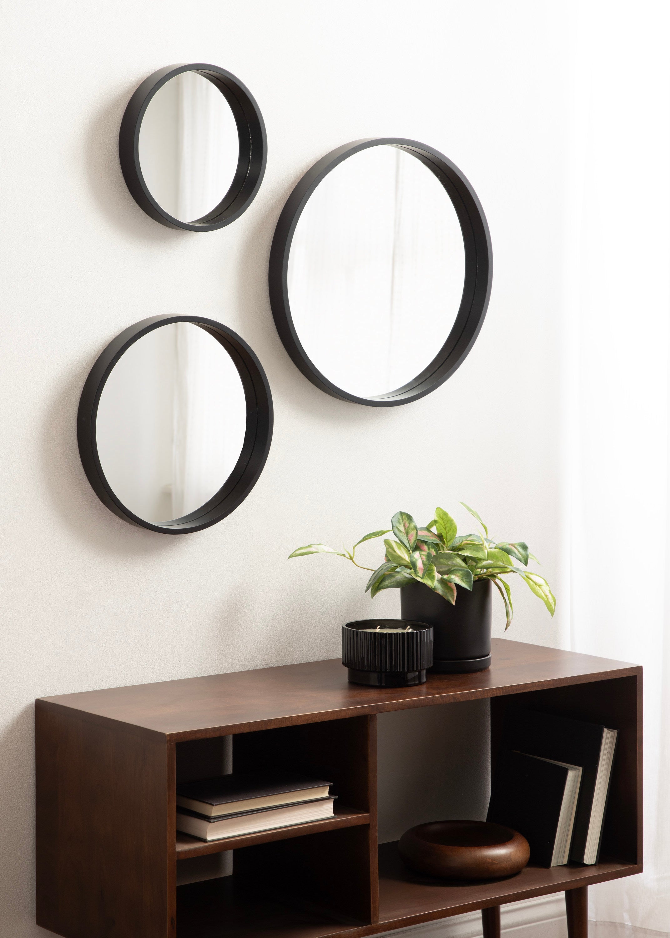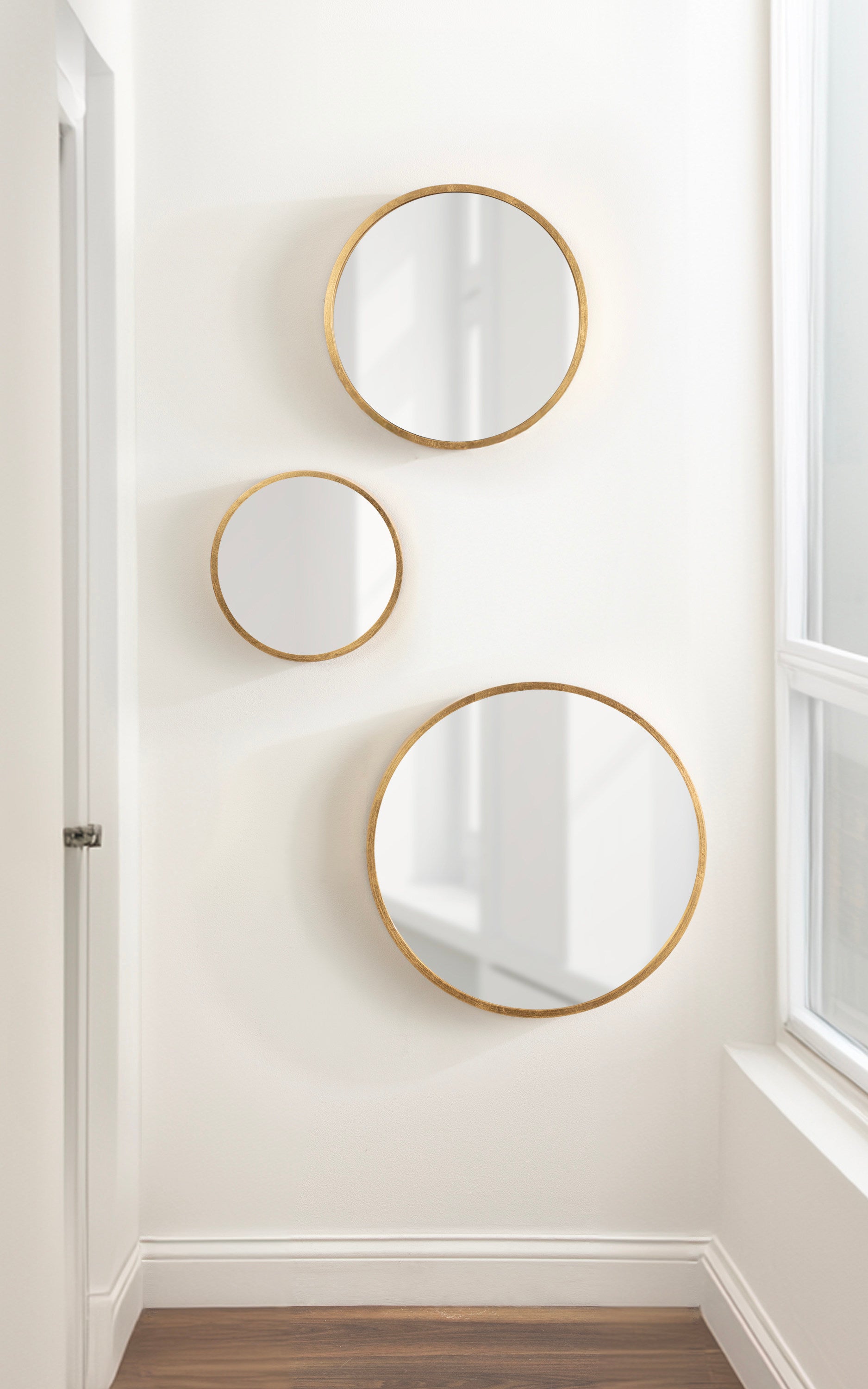 Decorate your blank wall with a collection of mirrors that bring modern beauty to your space. The Travis mirror set embraces modern style with slim minimal frame profiles and round mirror shapes. Each mirror has a different size and works well as a cohesive three-piece set, or spread throughout your home as individual accents. This means that at least one of the mirrors will likely fit the specific wall space you have in mind and allow you to change up the theme how you see fit. Using this set of mirrors for wall decor expands the light of your room, making it feel larger by projecting vibrancy throughout the open area. These cohesive round shapes easily blend into your home decor scheme with a fun, youthful energy. To install these mirrors on your wall, use the simple wire attached to each back.