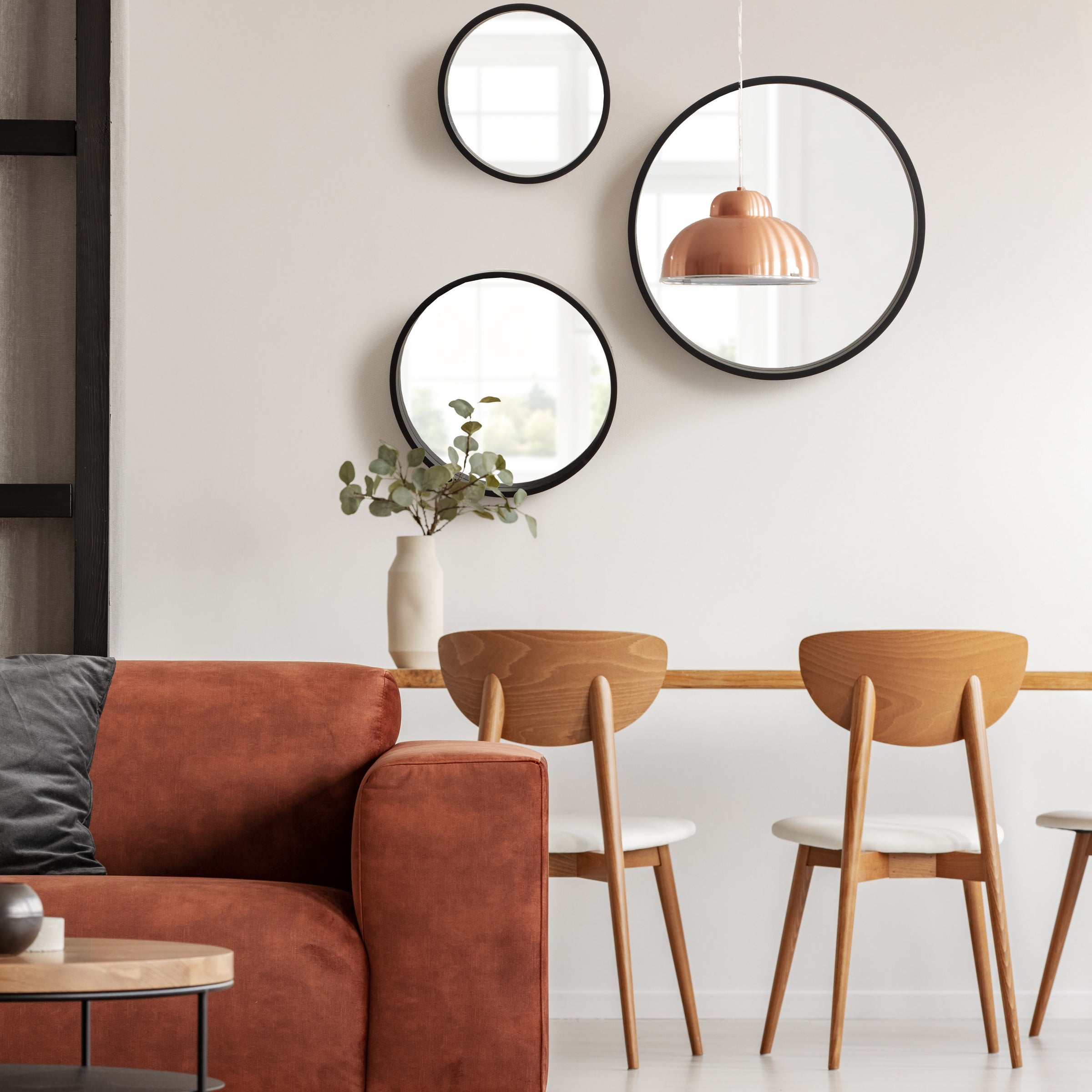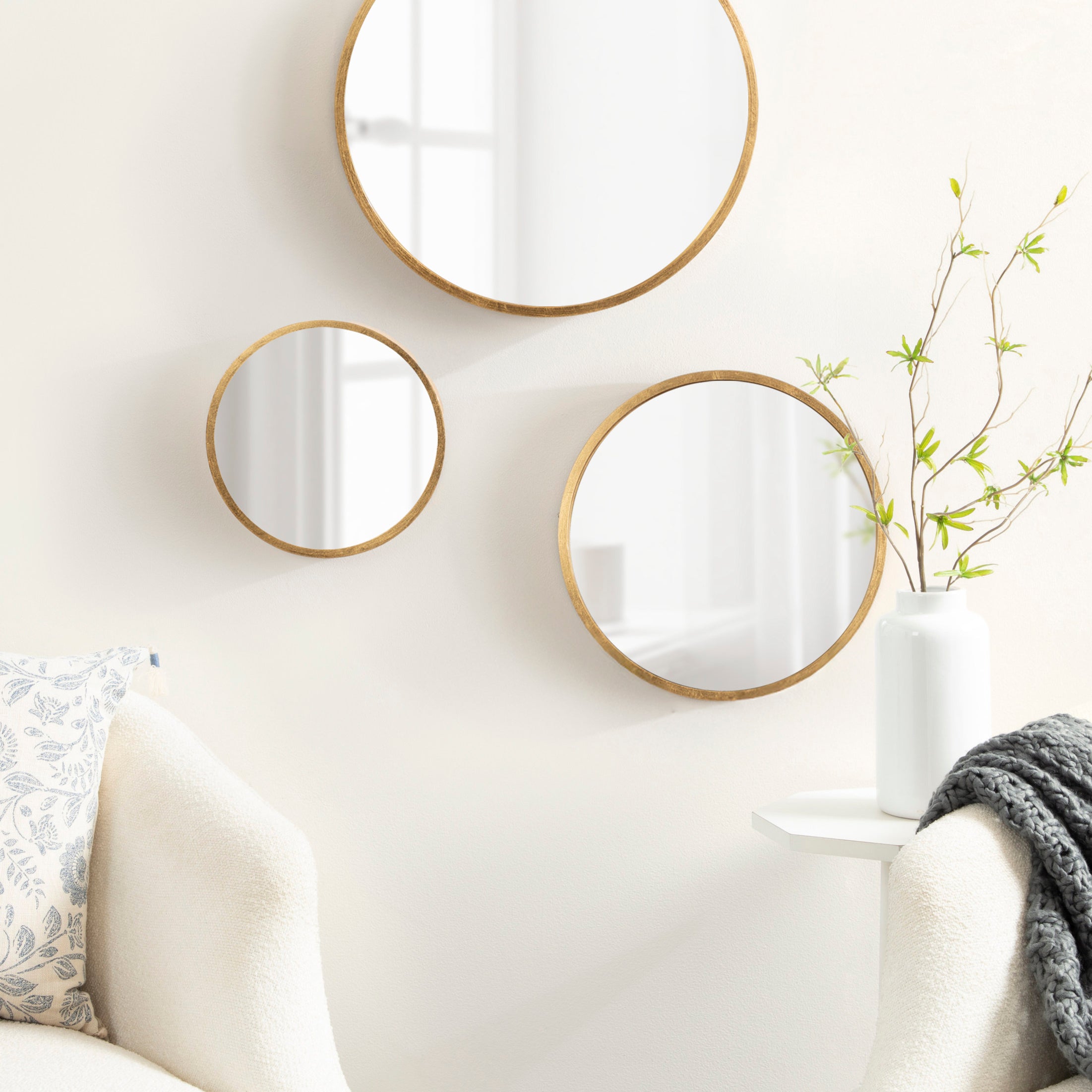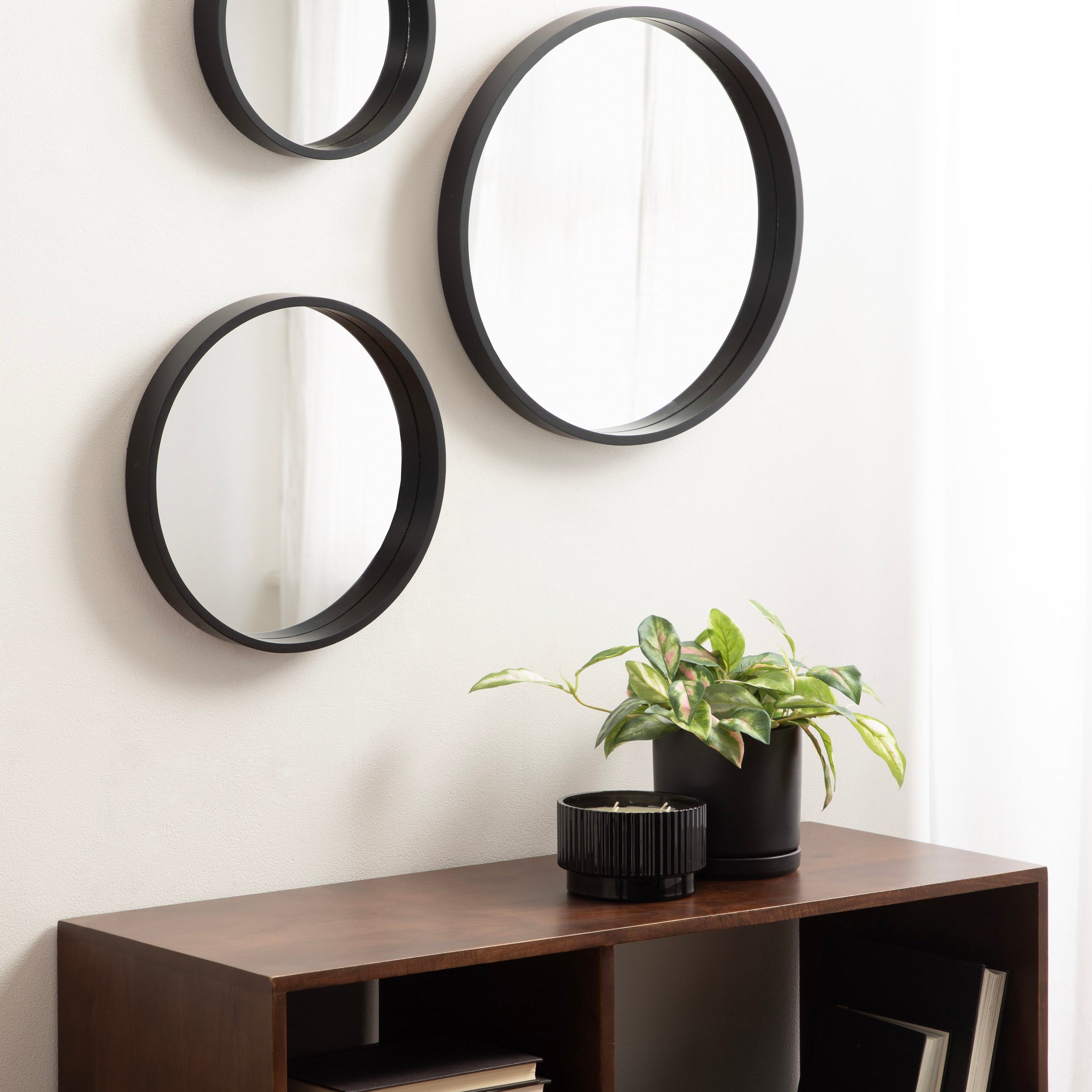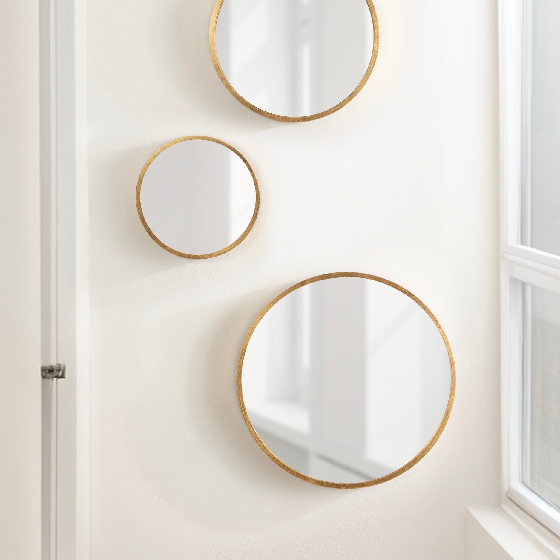 Decorate your blank wall with a collection of mirrors that bring modern beauty to your space. The Travis mirror set embraces modern style with slim minimal frame profiles and round mirror shapes. Each mirror has a different size and works well as a cohesive three-piece set, or spread throughout your home as individual accents. This means that at least one of the mirrors will likely fit the specific wall space you have in mind and allow you to change up the theme how you see fit. Using this set of mirrors for wall decor expands the light of your room, making it feel larger by projecting vibrancy throughout the open area. These cohesive round shapes easily blend into your home decor scheme with a fun, youthful energy. To install these mirrors on your wall, use the simple wire attached to each back.