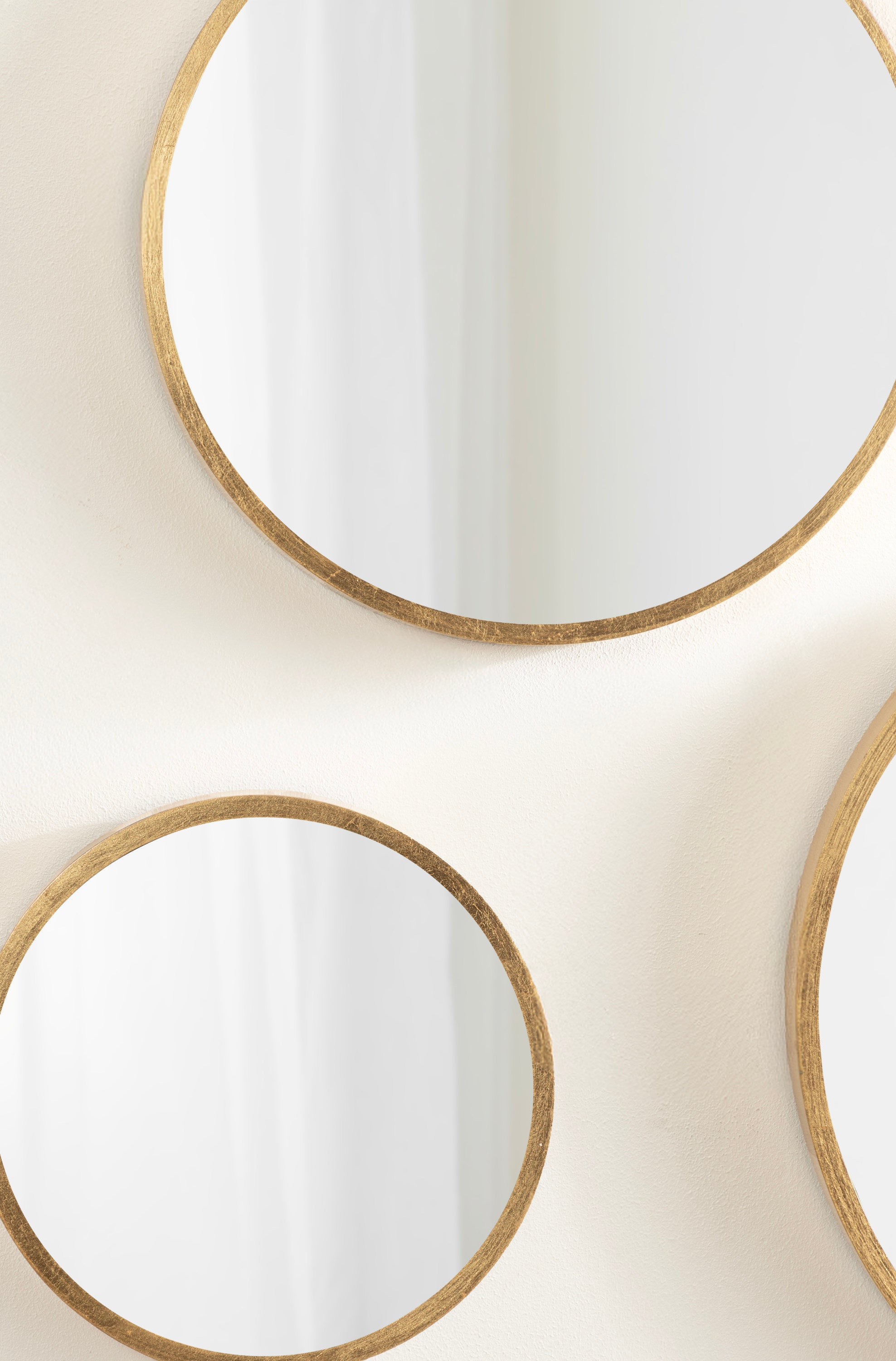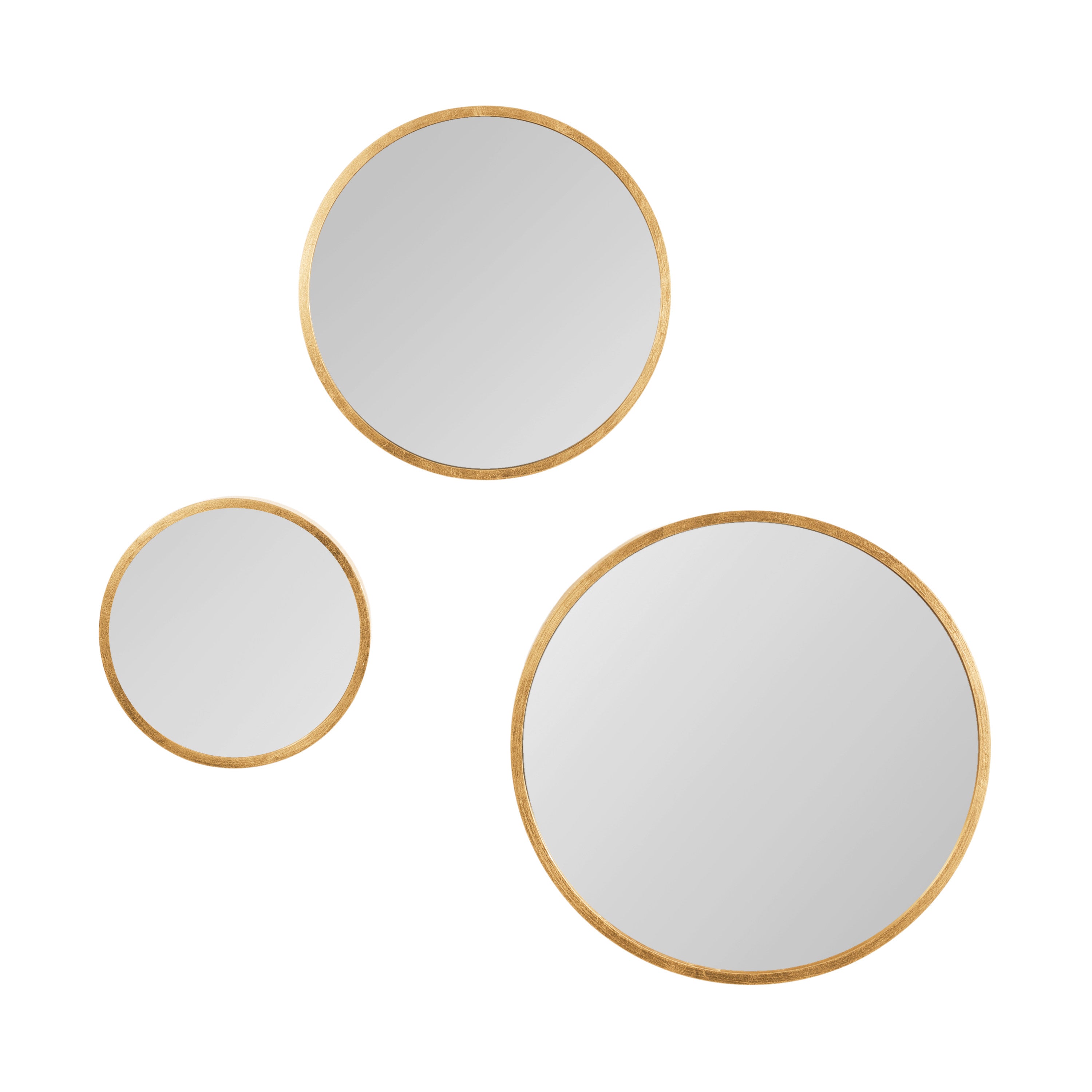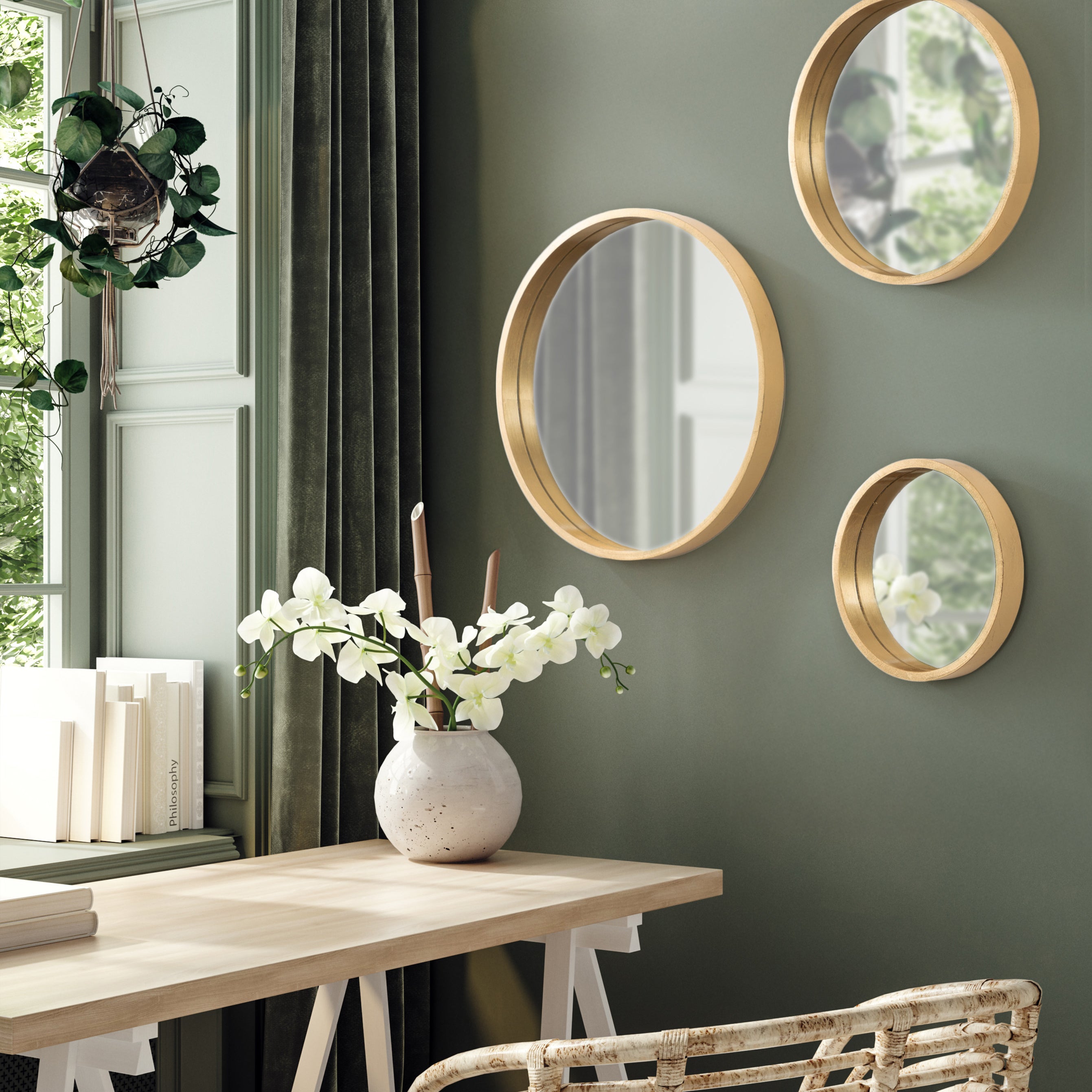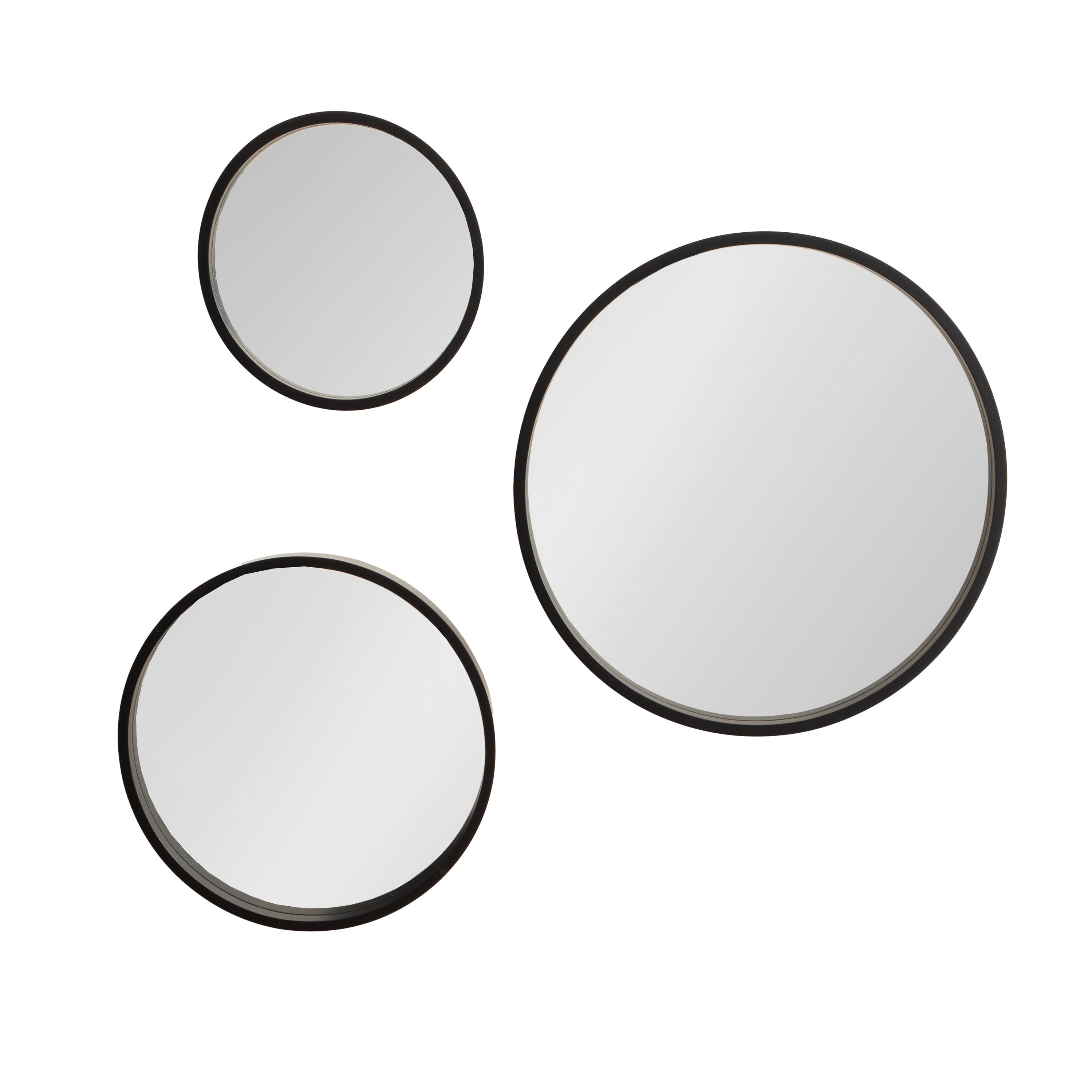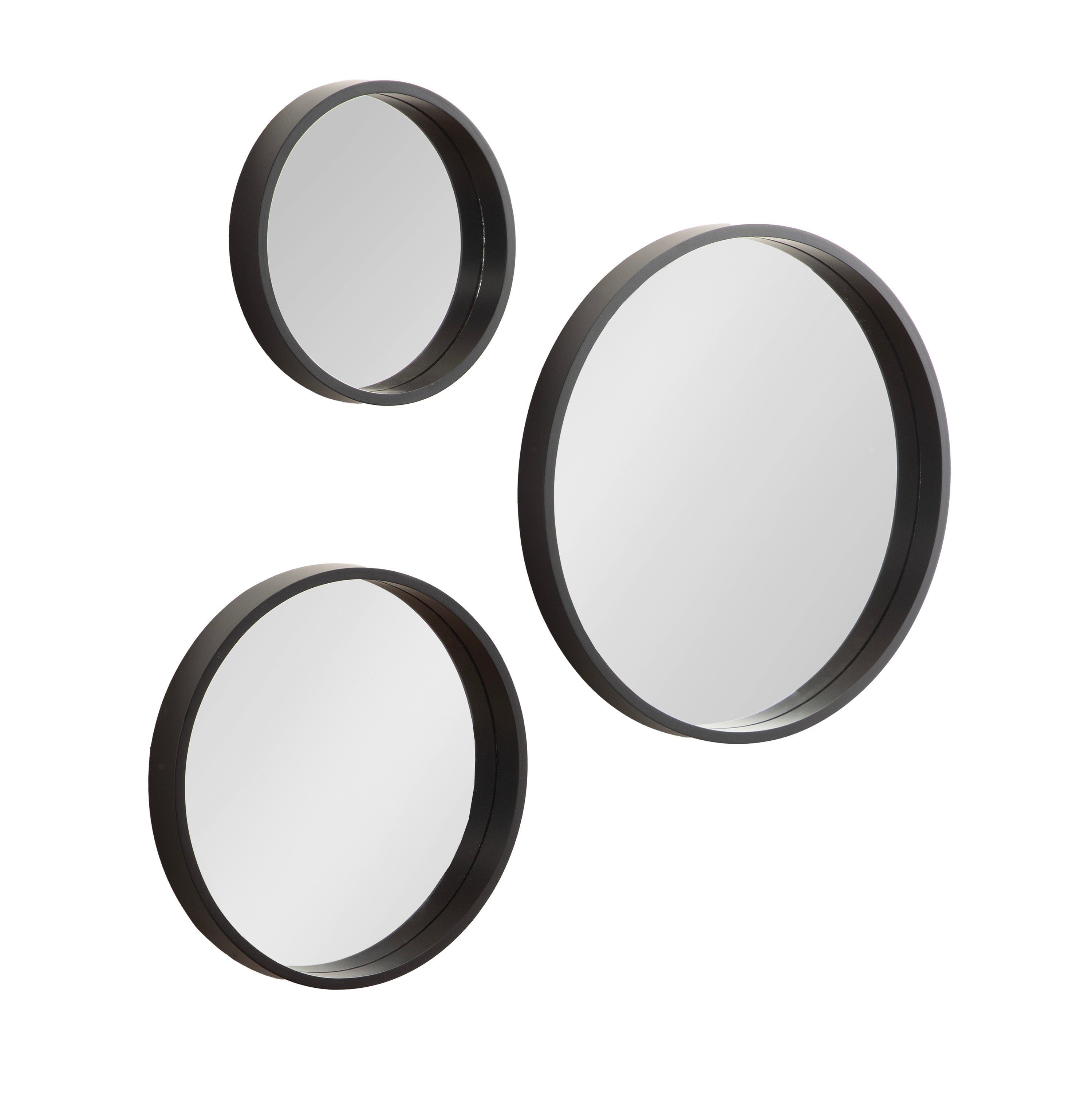 Decorate your blank wall with a collection of mirrors that bring modern beauty to your space. The Travis mirror set embraces modern style with slim minimal frame profiles and round mirror shapes. Each mirror has a different size and works well as a cohesive three-piece set, or spread throughout your home as individual accents. This means that at least one of the mirrors will likely fit the specific wall space you have in mind and allow you to change up the theme how you see fit. Using this set of mirrors for wall decor expands the light of your room, making it feel larger by projecting vibrancy throughout the open area. These cohesive round shapes easily blend into your home decor scheme with a fun, youthful energy. To install these mirrors on your wall, use the simple wire attached to each back.