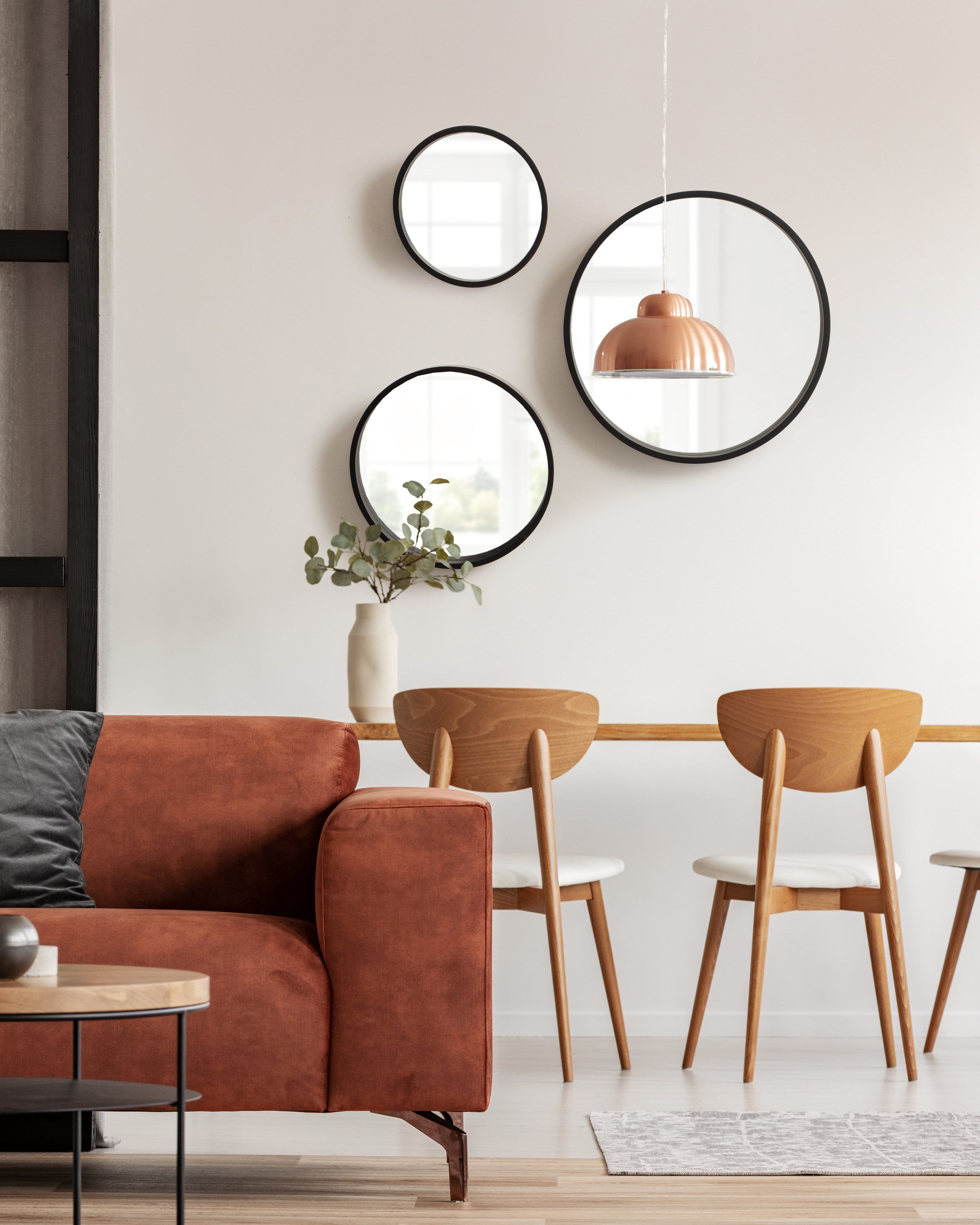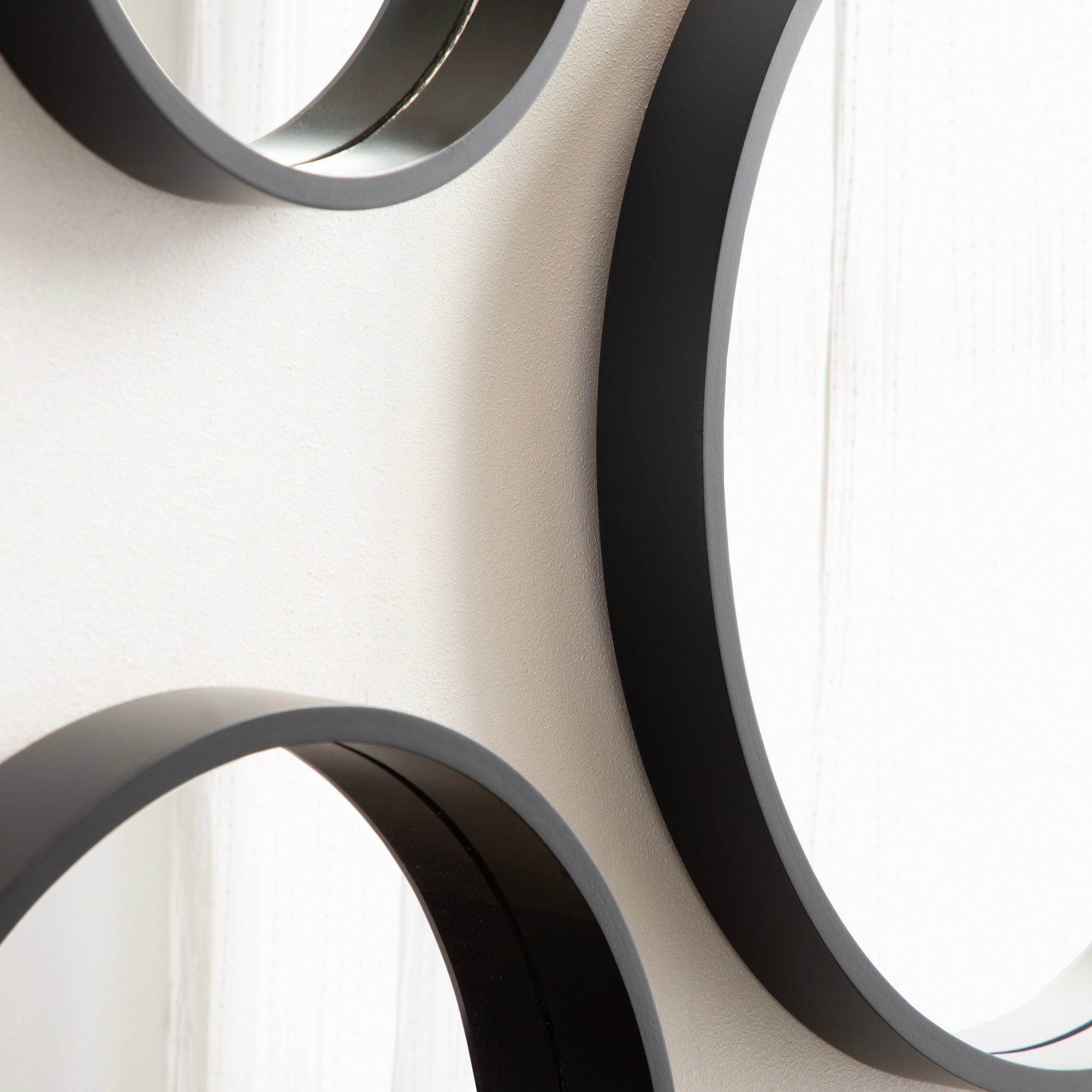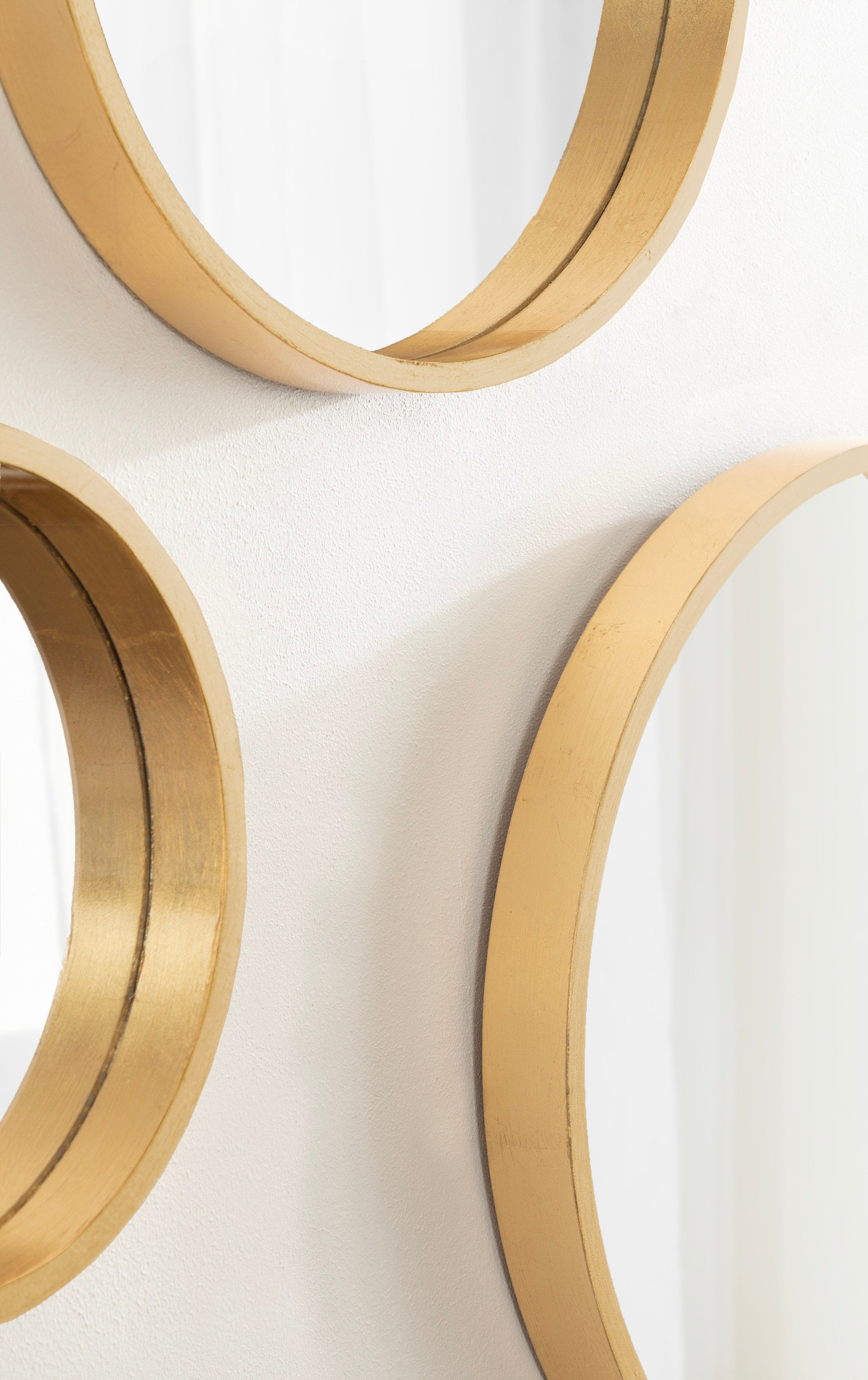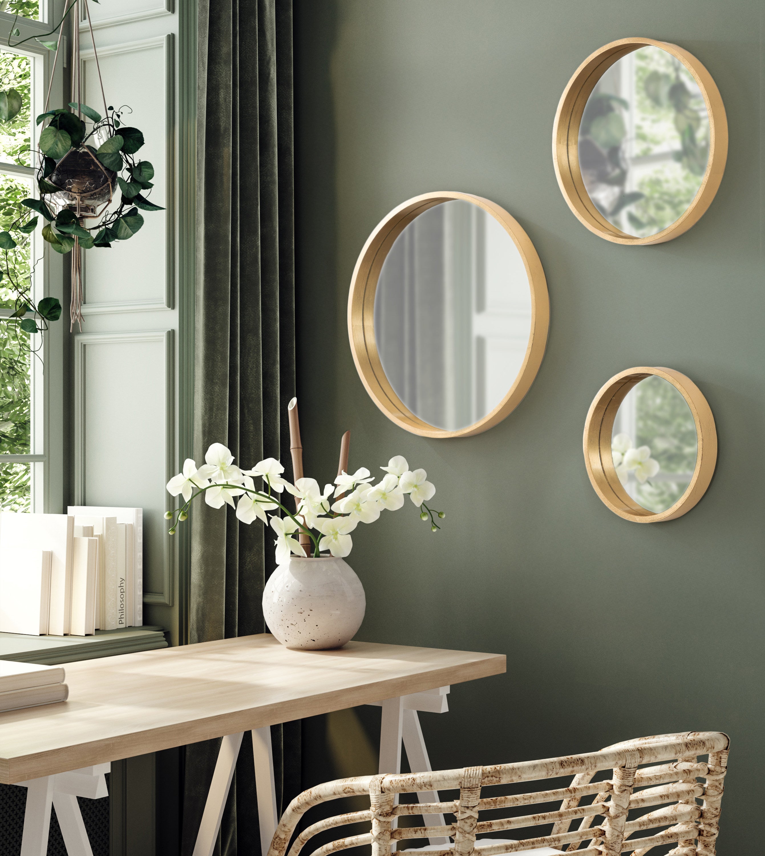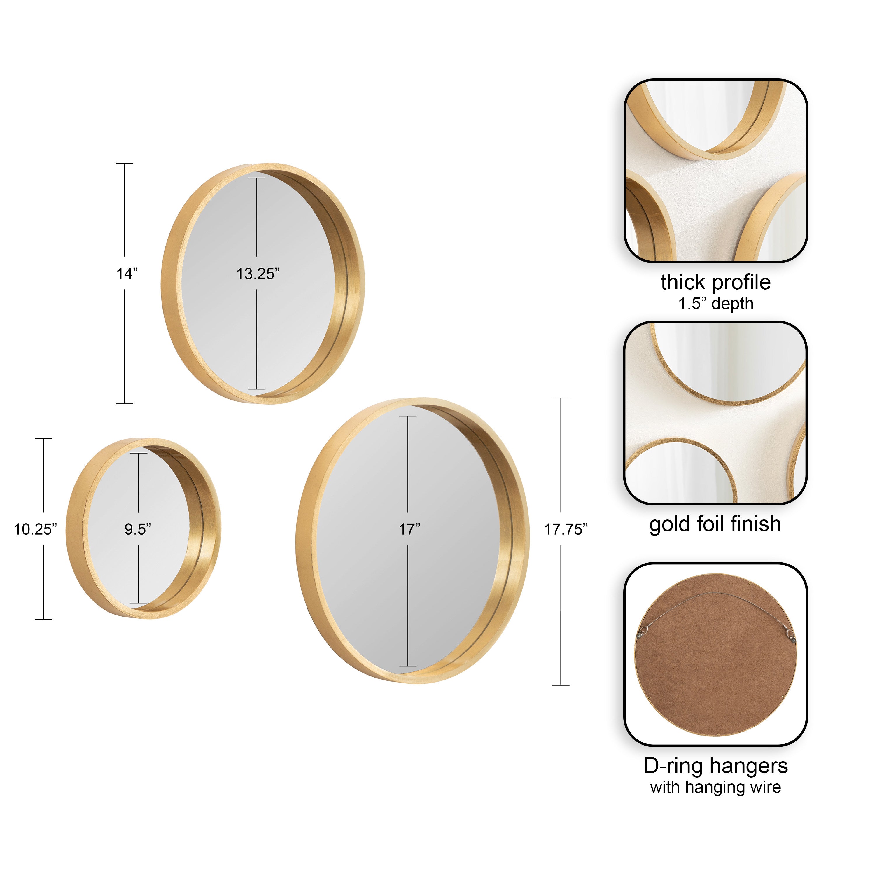Decorate your blank wall with a collection of mirrors that bring modern beauty to your space. The Travis mirror set embraces modern style with slim minimal frame profiles and round mirror shapes. Each mirror has a different size and works well as a cohesive three-piece set, or spread throughout your home as individual accents. This means that at least one of the mirrors will likely fit the specific wall space you have in mind and allow you to change up the theme how you see fit. Using this set of mirrors for wall decor expands the light of your room, making it feel larger by projecting vibrancy throughout the open area. These cohesive round shapes easily blend into your home decor scheme with a fun, youthful energy. To install these mirrors on your wall, use the simple wire attached to each back.