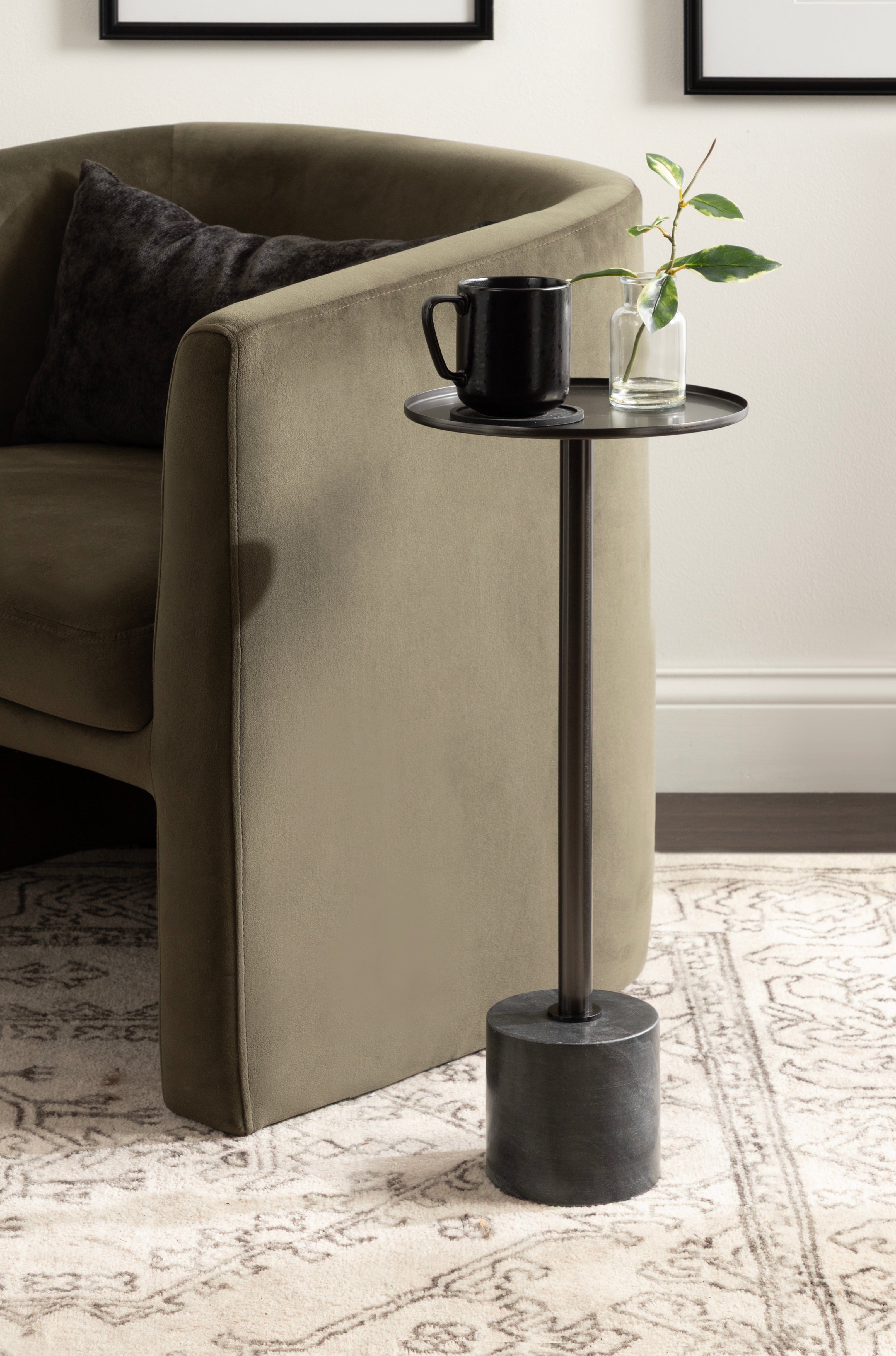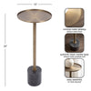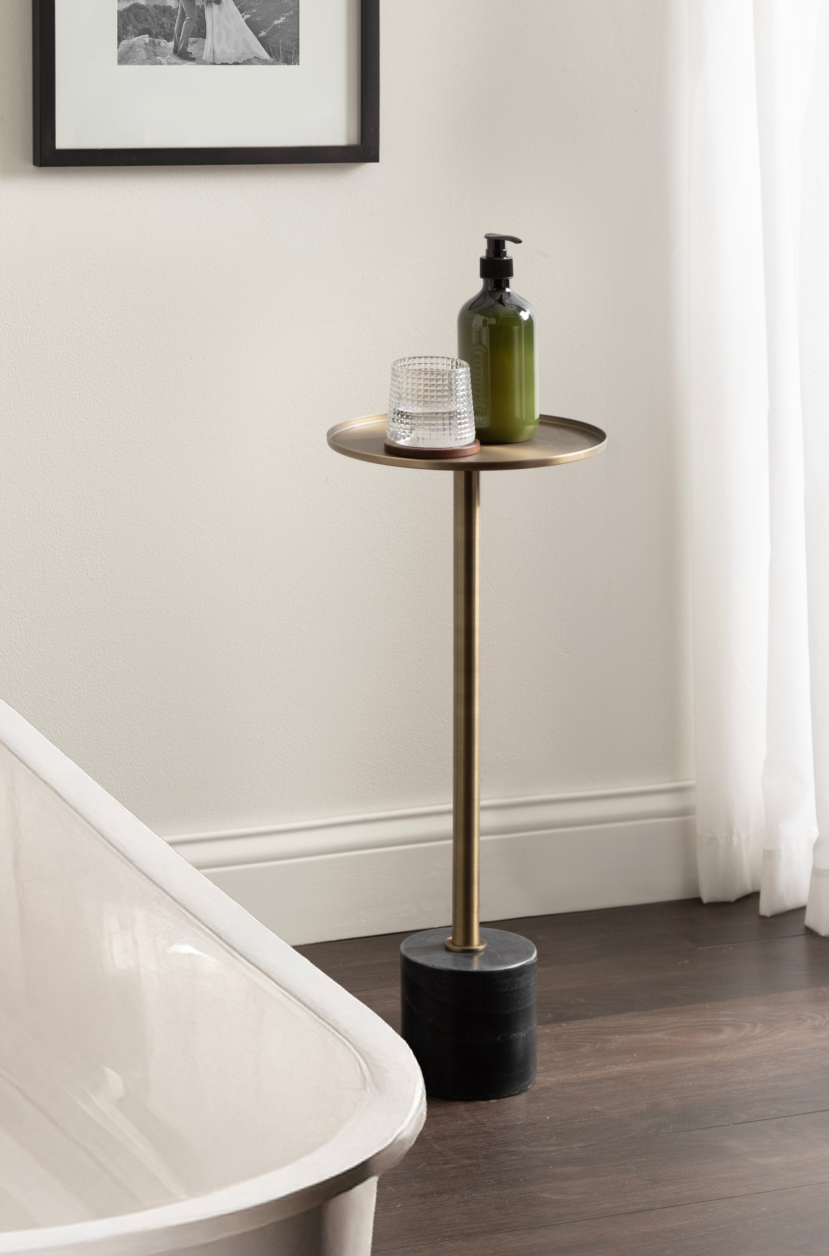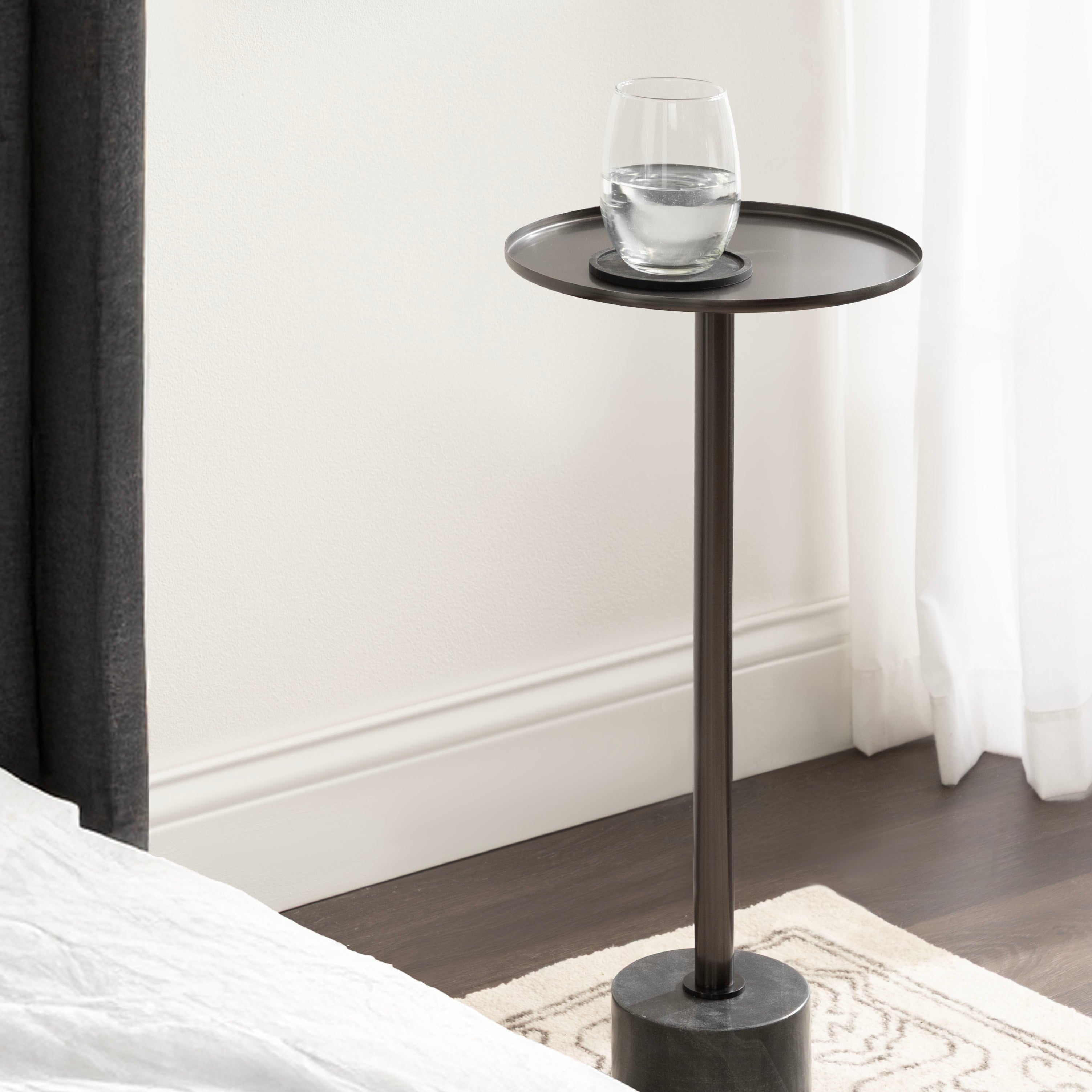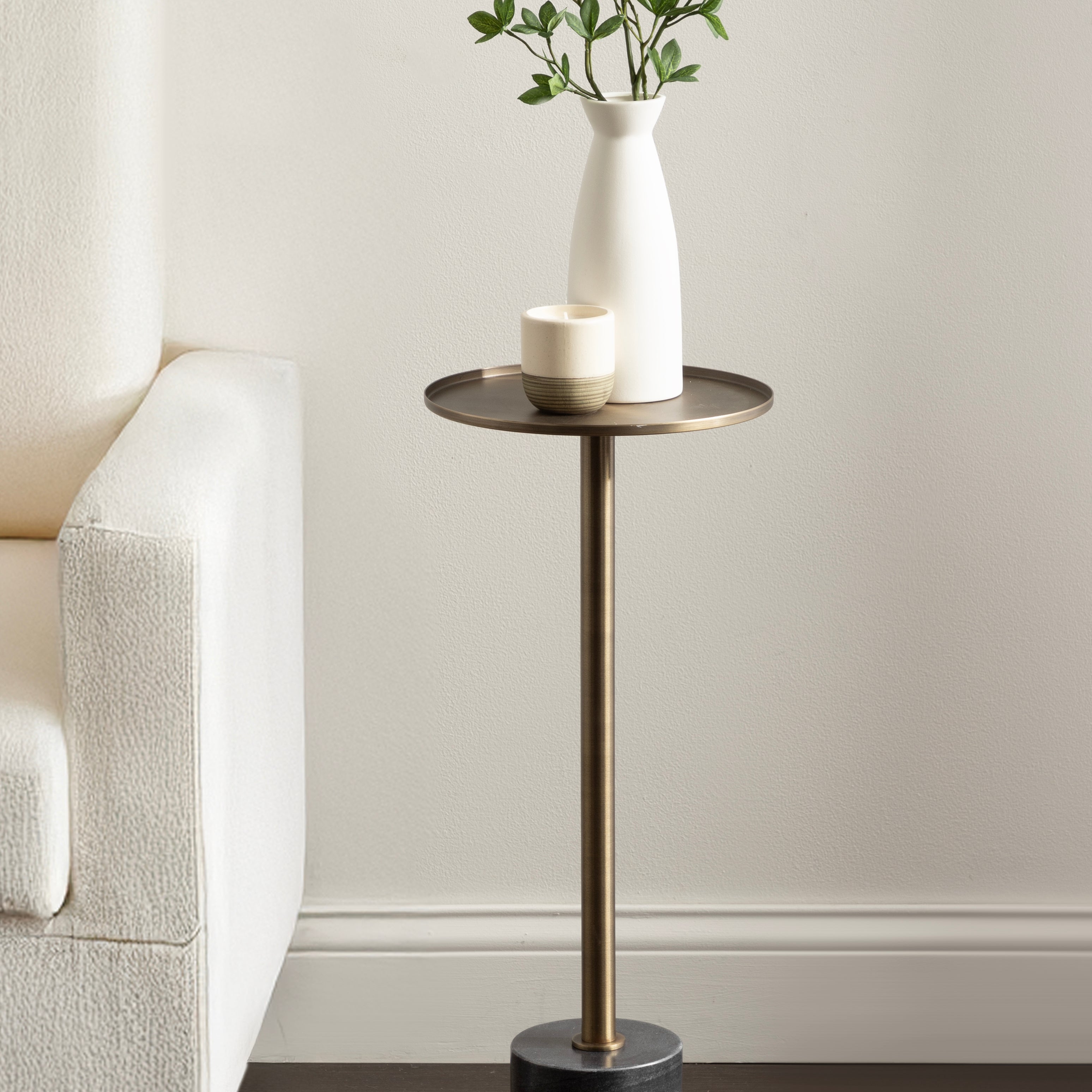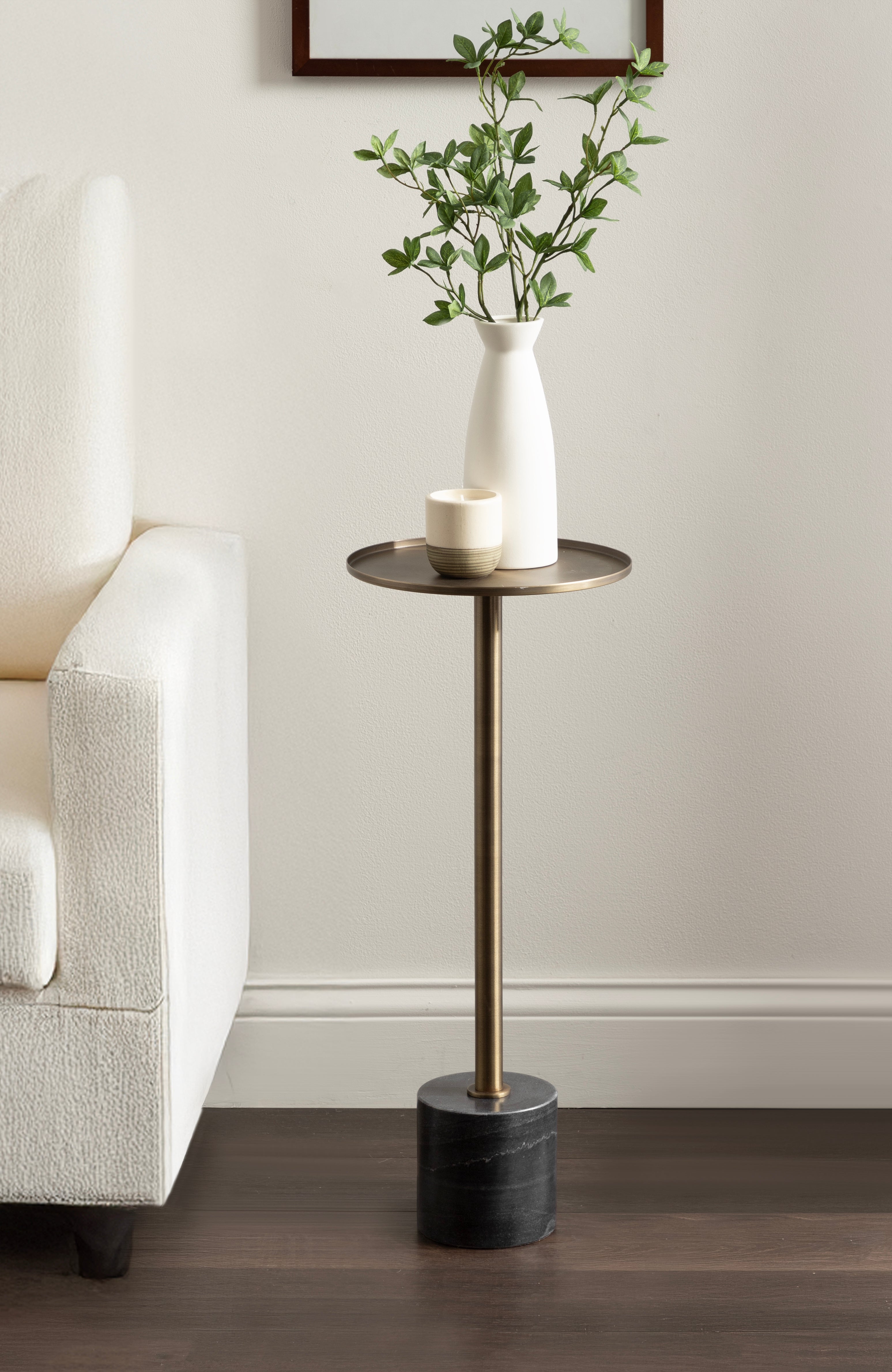 Showcase your nightly drink or a favorite houseplant with this stunning Vanora marble drink table. Constructed from premium materials, the Vanora drink table features a natural marble base and a durable metal tabletop. The Vanora's marble base not only wows as a stunning natural stone, but it also is weighted to keep drinks from spilling or the table from toppling. The iron tabletop also features a slight lip to help keep items a bit more secure as well. Handcrafted by artisans in India, each Vanora is truly one-of-a-kind. The marble base is made from natural marble stone, meaning there will be variations in veining within each piece. The Vanora mini table is a versatile pedestal table that provides elegance and sophistication to various settings throughout your home: living room, bedroom, bathroom, entryway, or family room. This useful tabletop size is perfect for holding a couple of drinks or showcasing your favorite plant stand.