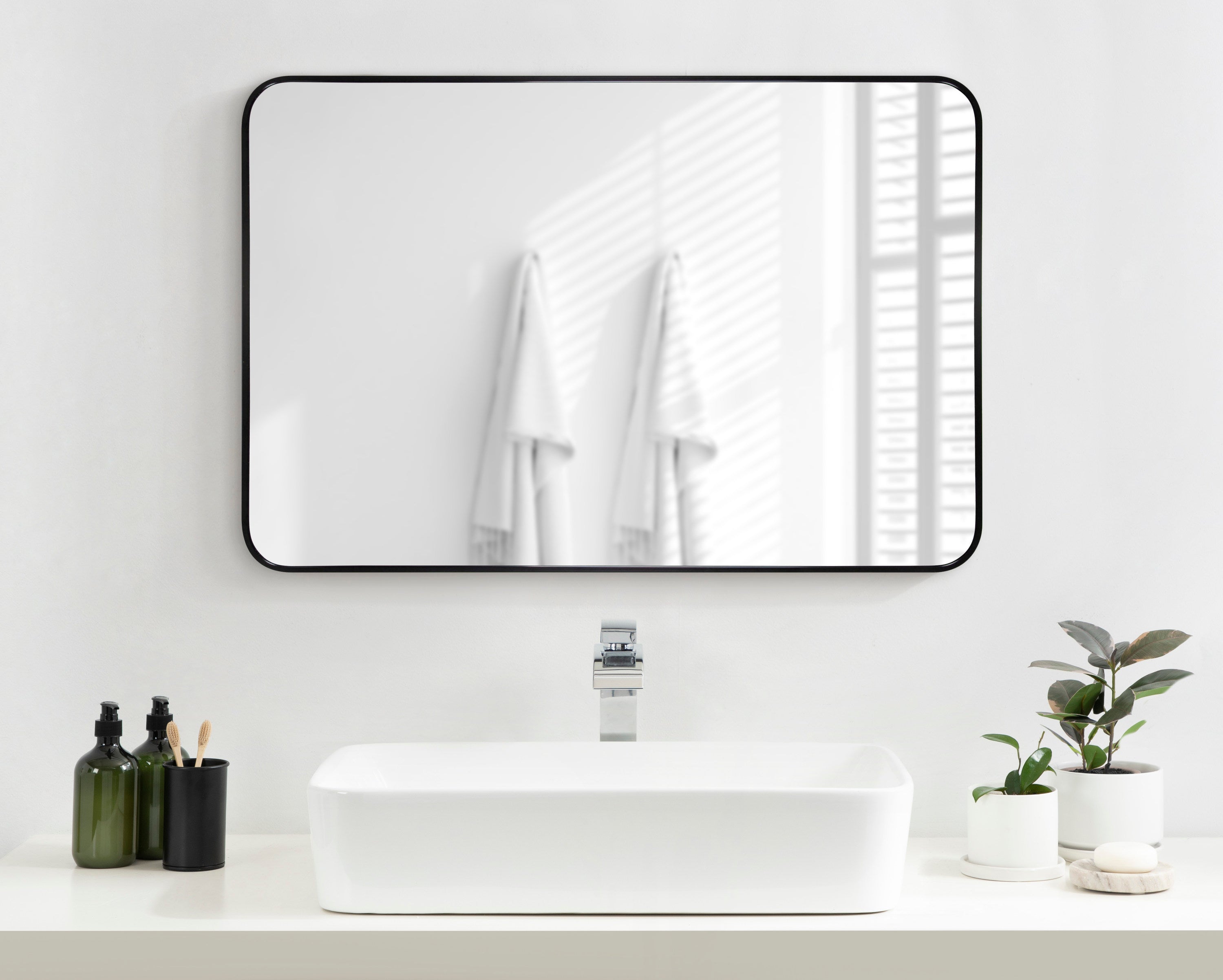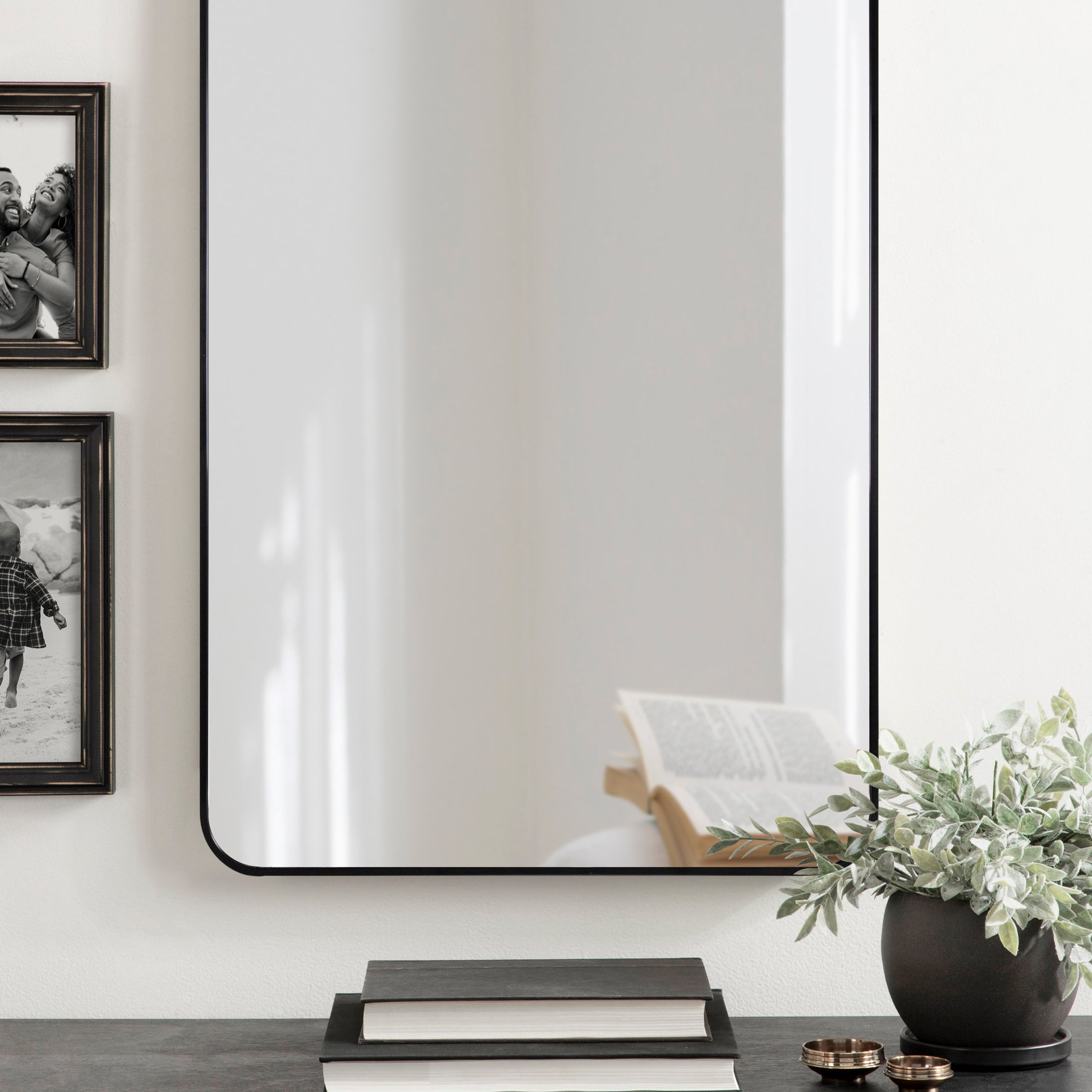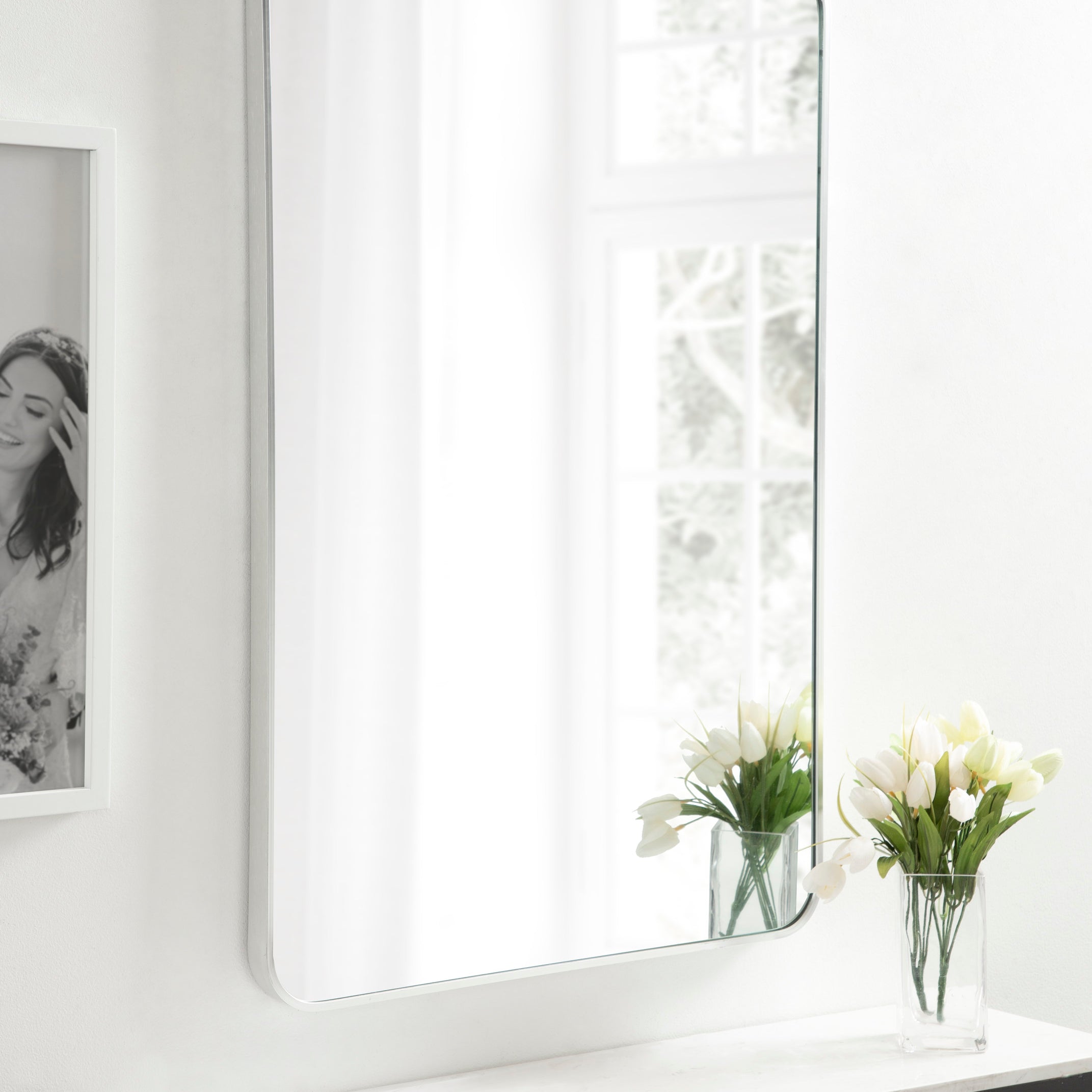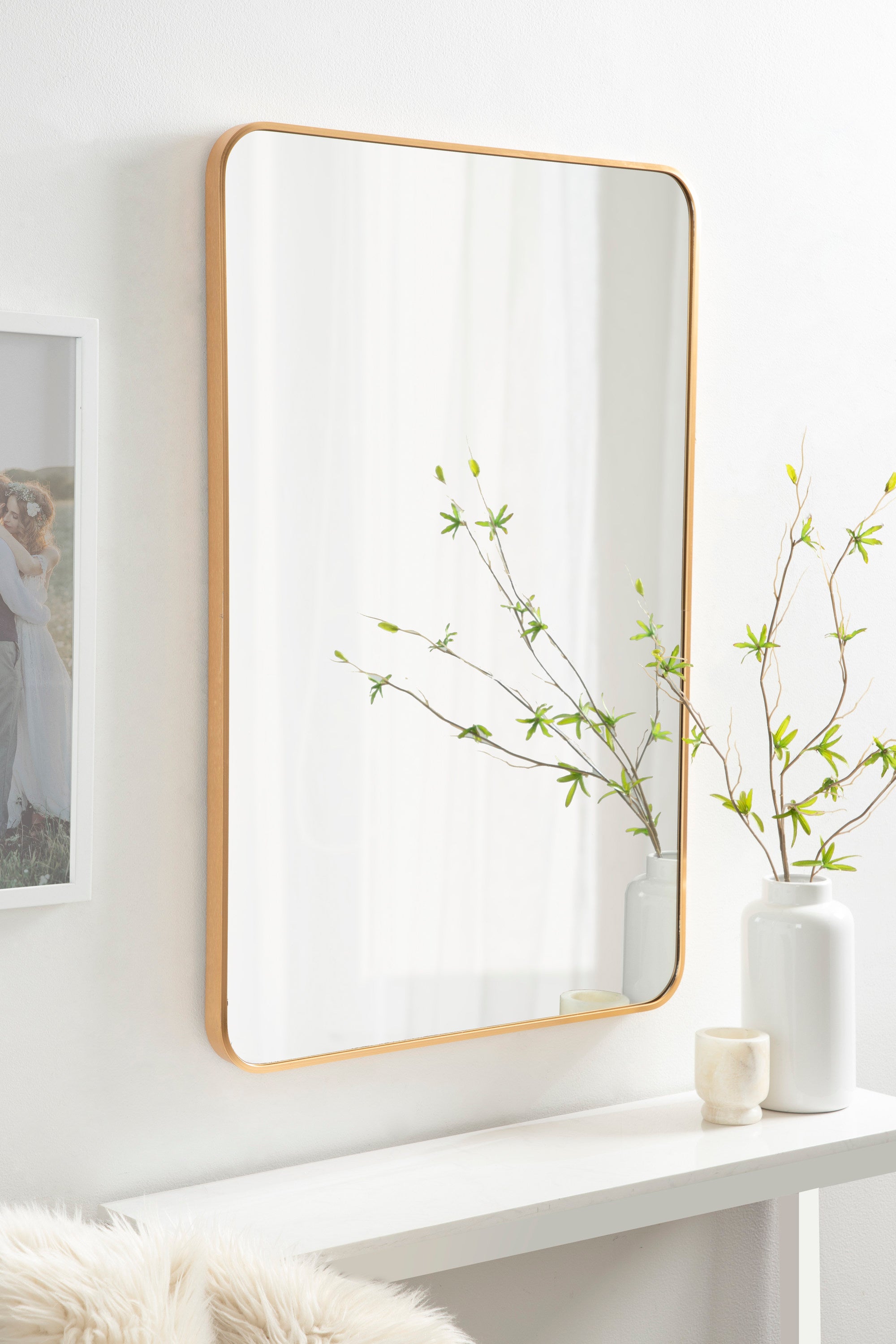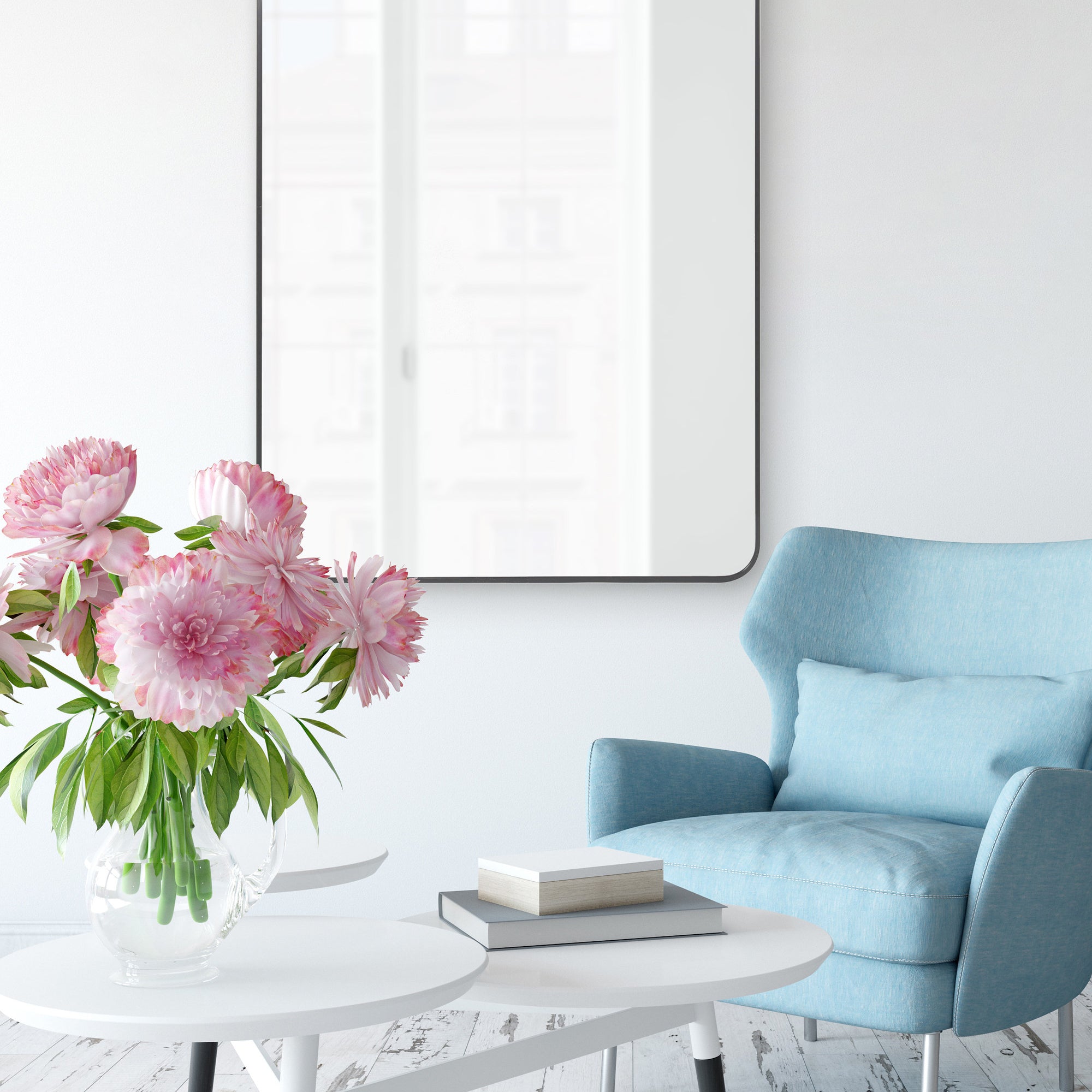 This Zayda rectangular mirror defines stylish simplicity. The combination of smooth curves and a slim frame profile catches attention but blends seamlessly with your decor. This modern option is constructed from resilient aluminum, making it durable and light enough to hang easily.